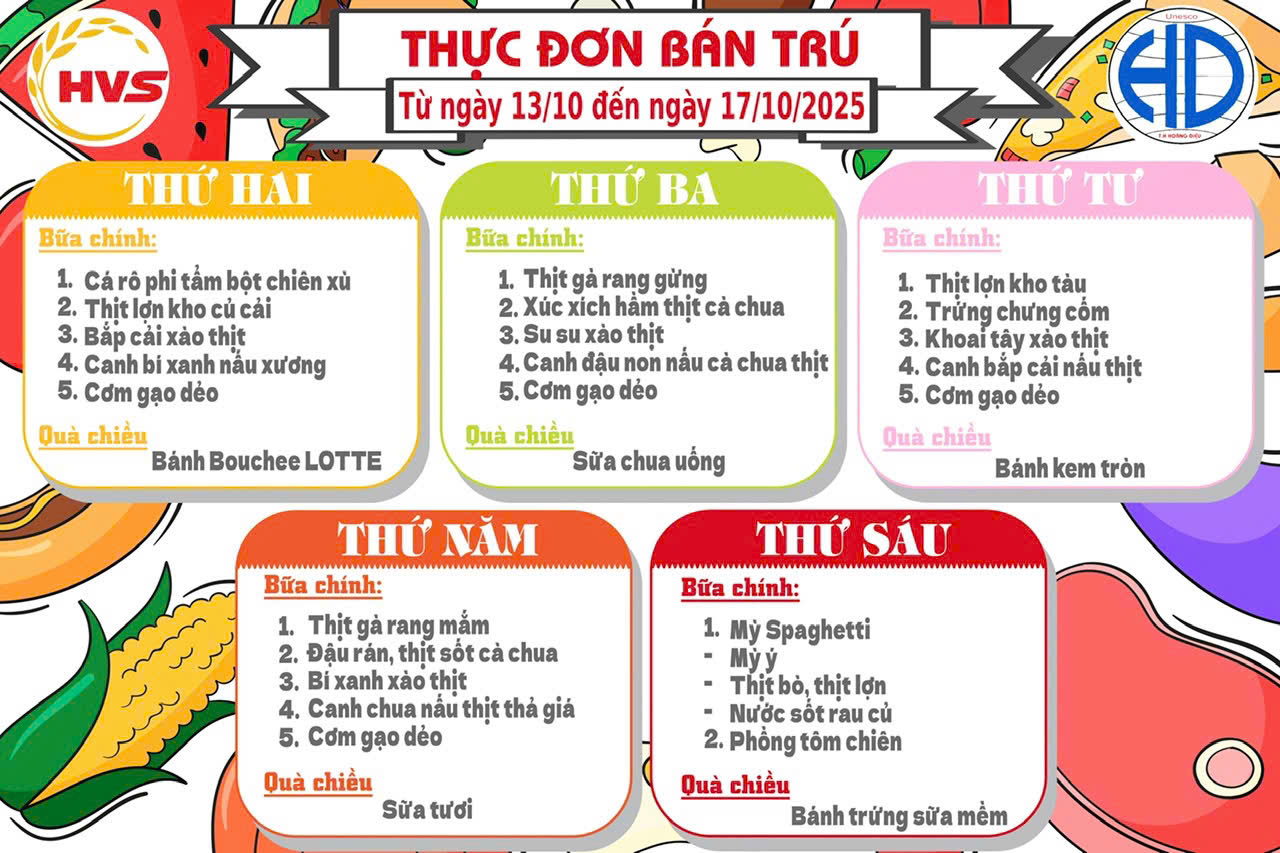 Thực đơn bán trú từ 13/10 đến 17/10/2025