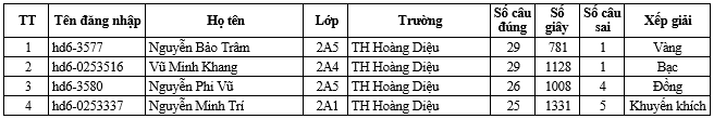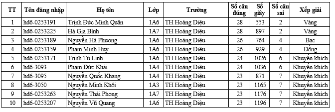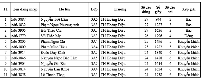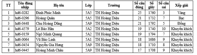 Trường Tiểu học Hoàng Diệu thông báo danh sách học sinh đạt giải vòng thi cấp Quận sân chơi Đấu trường Toán học Vioedu năm học 2024-2025