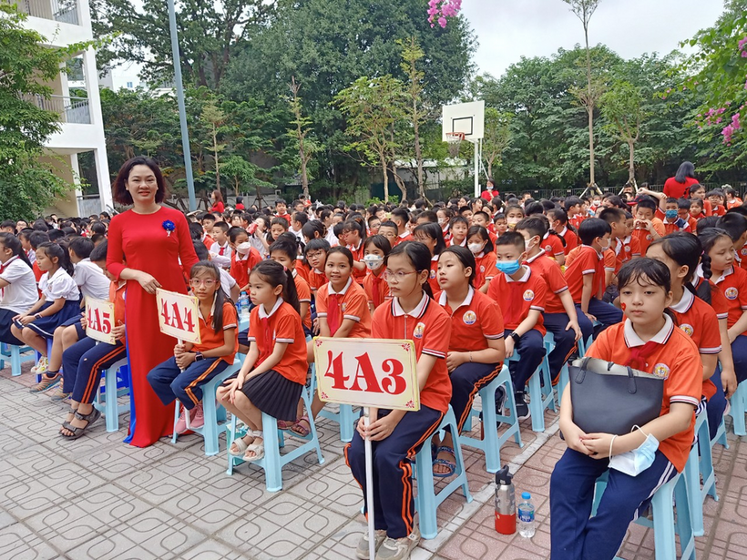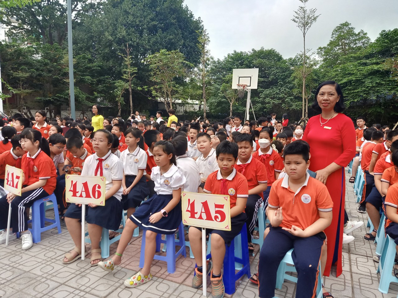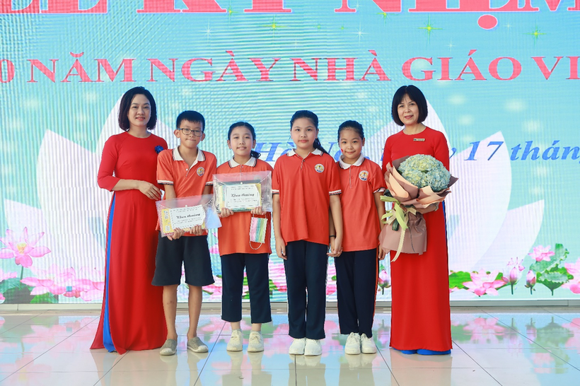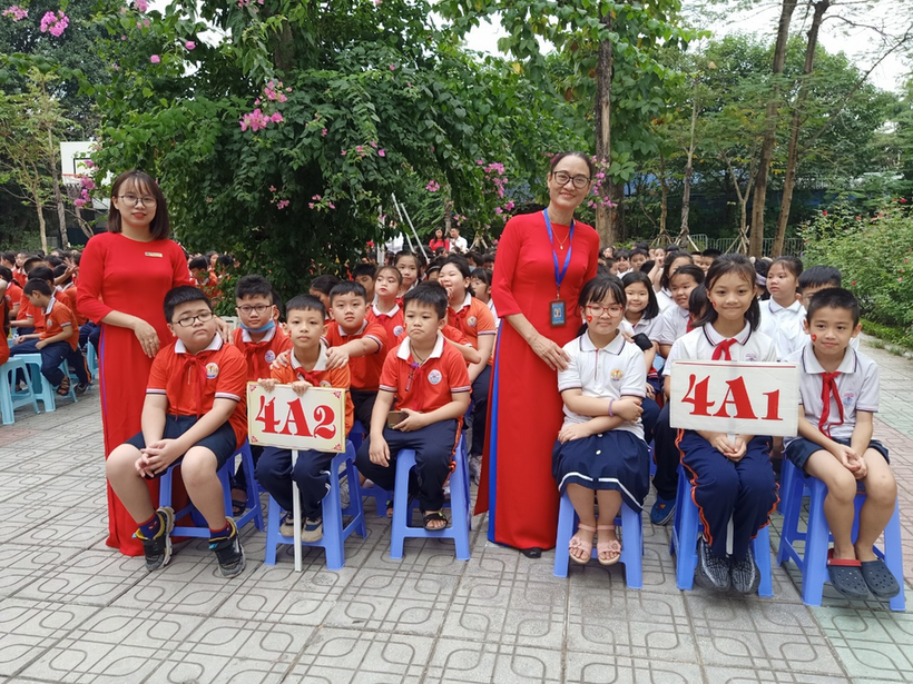 Các cô giáo chủ nhiệm và học sinh khối 4 tham dự lễ kỷ niệm 40 năm ngày Nhà giáo Việt Nam trên sân trường.