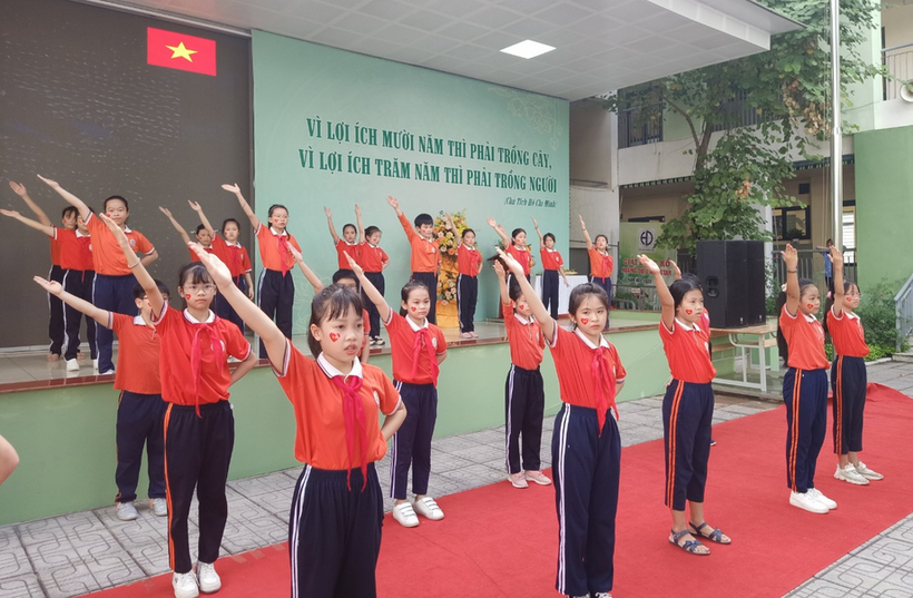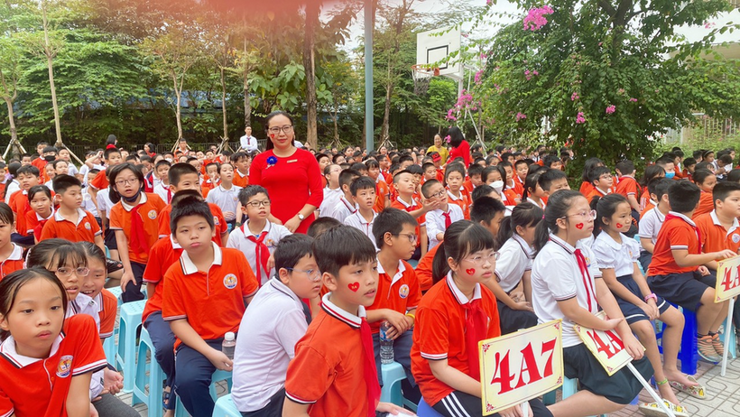 Trong đó, 70 học sinh đại diện cho hơn 300 em lớp 4 của trường đã cùng tham gia vào vũ khúc sân trường sôi động với bài Việt Nam ơi! Dù số lượng học sinh tham gia đông nhưng các bạn vẫn thể hiện tốt các động tác nhảy kỹ thuật, đều, đẹp, thể hiện sự khỏe khoắn, phù hợp với tiết mục và lứa tuổi.