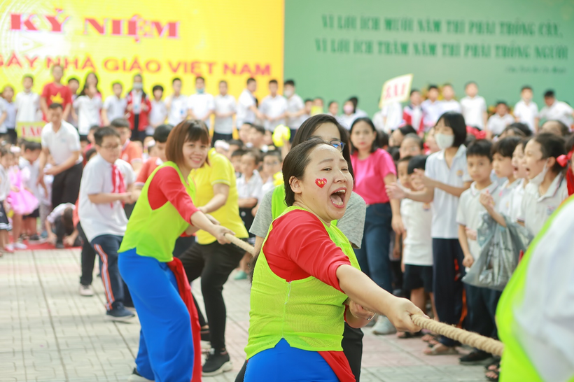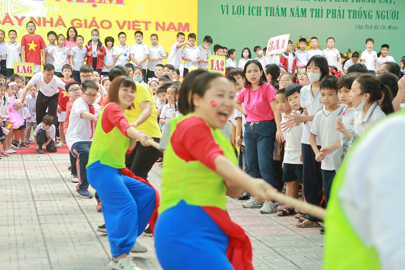 Sau hội diễn văn nghệ, tiết mục kéo co giữa các đội gồm cả giáo viên và học sinh là một hoạt động vô cùng sôi nổi bởi tiếng hò reo cổ vũ không ngớt của các em.