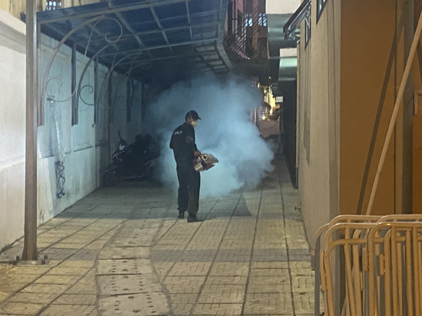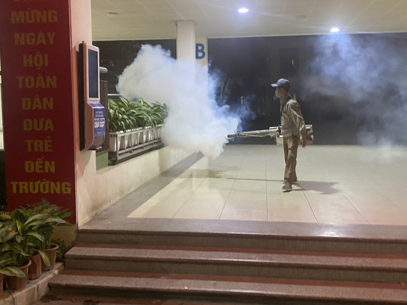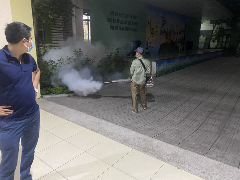 Dưới đây là một số hình ảnh cán bộ y tế phường Cống Vị thực hiện phun thuốc diệt muỗi tại trường Tiểu học Hoàng Diệu: