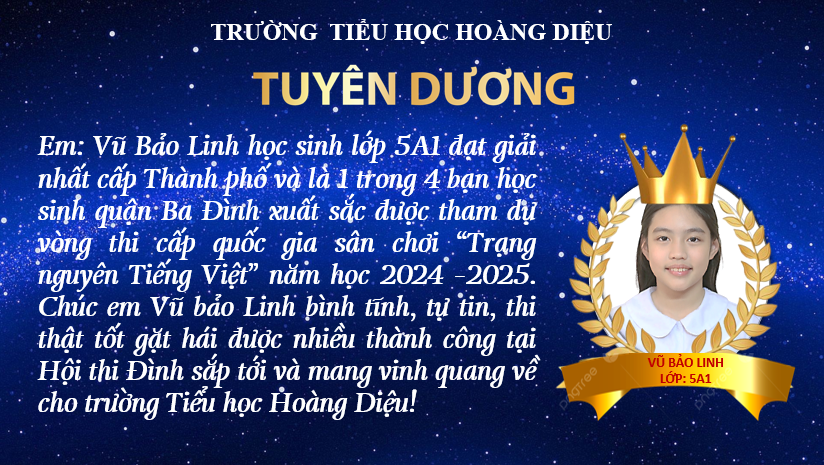 Một lần nữa, xin chúc các thí sinh toàn quốc nói chung và em Vũ Bảo Linh nói riêng sẽ gặt hái được nhiều thành công tại Hội thi Đình sắp tới. Chúc cho sân chơi “Trạng nguyên Tiếng Việt” ngày càng phát triển, nuôi dưỡng những thế hệ học sinh giỏi tiếng Việt, yêu văn hóa dân tộc! Chúc em Vũ Bảo Linh thi thật tốt và mang vinh quang về cho trường Tiểu học Hoàng Diệu!