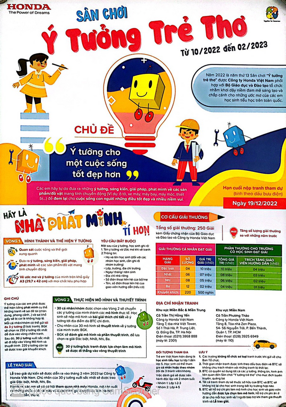 Sân chơi được chính thức khởi động từ ngày 12/10/2022 với chuỗi hoạt động tập huấn trực tiếp tại 10 tỉnh thành trên cả nước. Tham gia sân chơi, các em sẽ trải qua 02 vòng thử thách bao gồm: (1) Hình thành và Thể hiện ý tưởng trên tranh vẽ, (2) Thực hiện mô hình và Thuyết trình ý tưởng thể hiện qua mô hình.