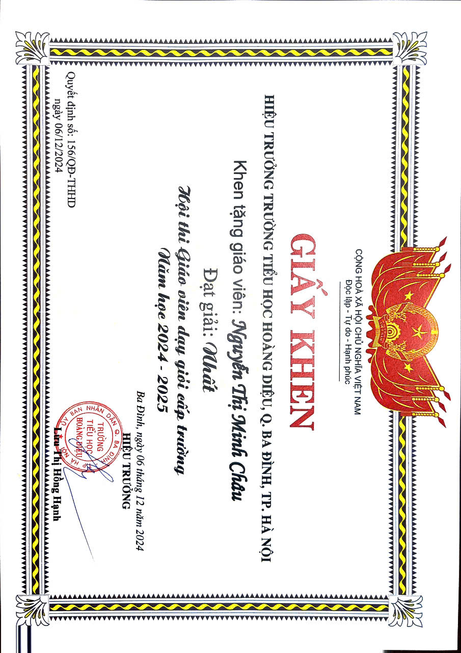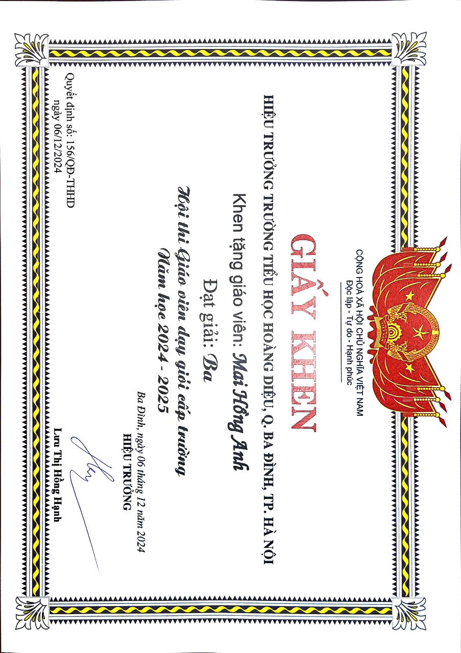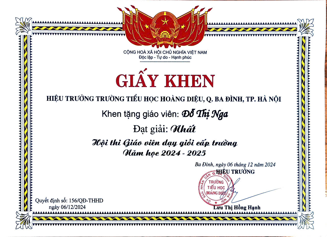 Xin chúc mừng các cô giáo! Hy vọng rằng sự sáng tạo và nhiệt huyết của các cô tiếp tục lan tỏa, góp phần xây dựng trường Tiểu học Hoàng Diệu ngày càng phát triển và vững mạnh.