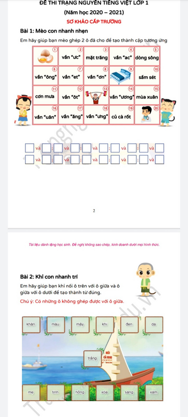 MỘT SỐ ĐỀ THI TRẠNG NGUYÊN TIẾNG VIỆT GỢI Ý CHO HỌC SINH LỚP 1
