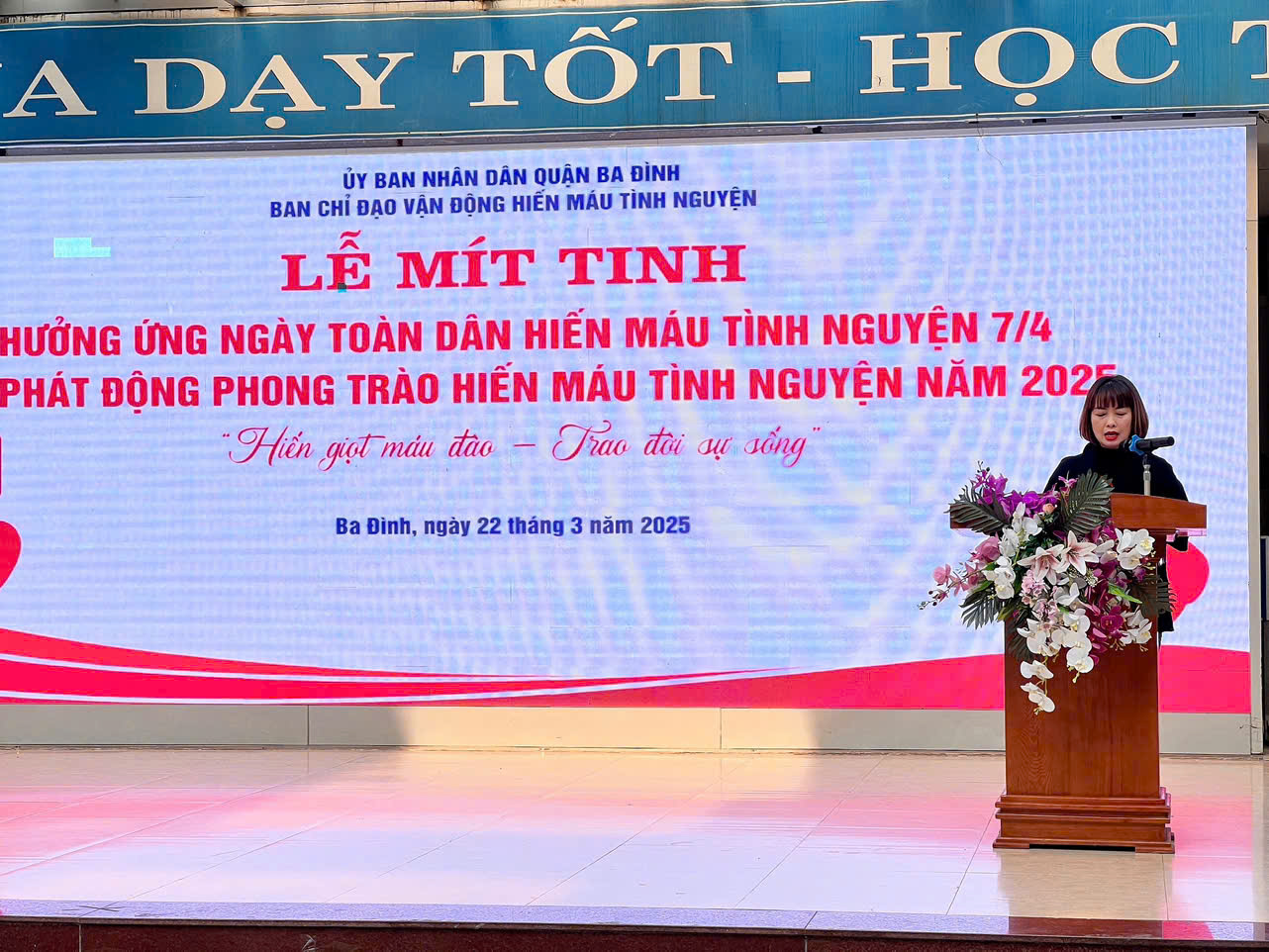 Đại diện cho tập thể Công đoàn trường TH Hoàng Diệu, cô giáo Nguyễn Thu Hà – Chủ tịch Công đoàn vinh dự tham gia phát biểu hưởng ứng trong buổi Lễ khai mạc Ngày hội Hiến máu tình nguyện năm 2025 của Đoàn viên, Công nhân Viên chức Lao động do Ban chỉ đạo vận động Hiến máu tình nguyện quận Ba Đình phối hợp với Viện Huyết học Truyền máu Trung ương tổ chức.