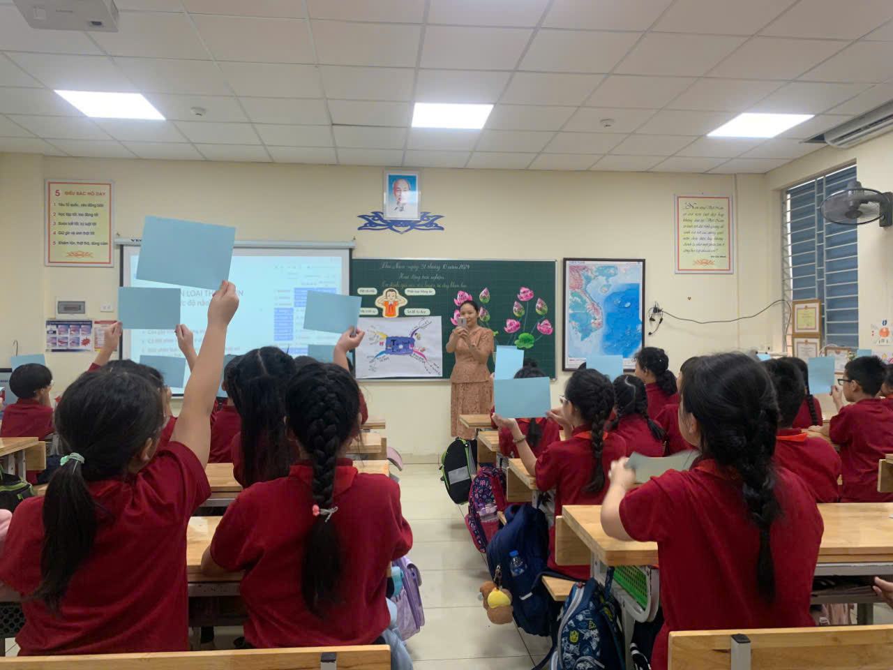 Cô giáo Đỗ Thị Nga trong một tiết dạy học Hoạt động trải nghiệm cùng 38 em học sinh lớp 4A4