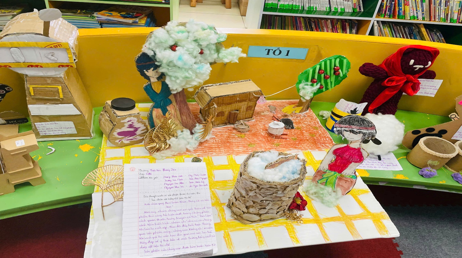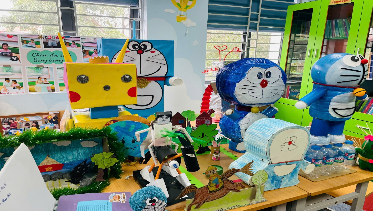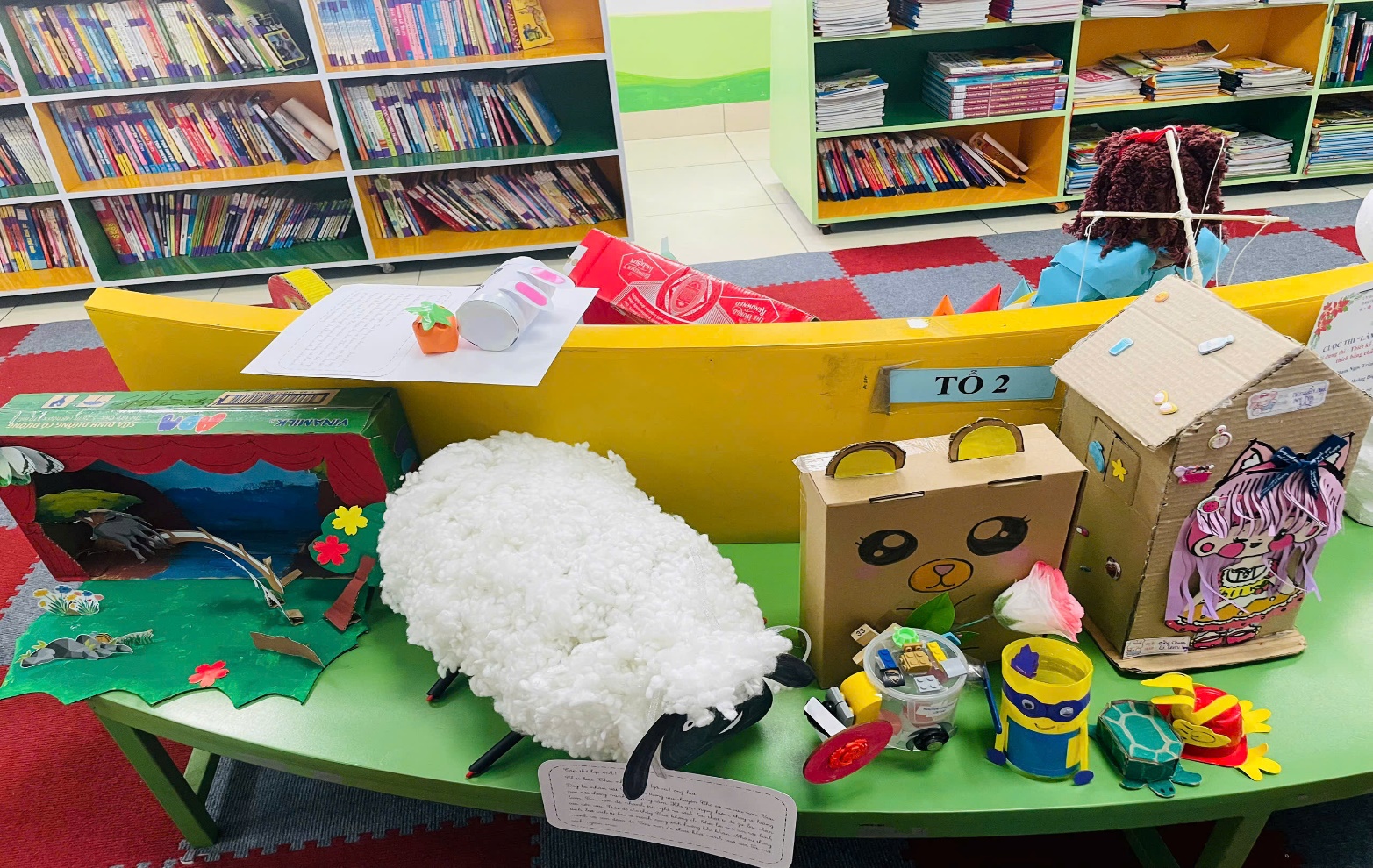 Đối với học sinh khối lớp 3,4,5 các em được lựa chọn và thiết kế nhân vật em yêu thích bằng chất liệu tái chế. Qua mỗi bức vẽ có thể thấy được mỗi học sinh đều có những phát hiện riêng, suy nghĩ riêng. Với trí tưởng tượng phong phú và kỹ năng tư duy, các em đã thể hiện câu chuyện bằng những bức vẽ sinh động, những góc nhìn vui tươi. Đôi khi cùng một câu chuyện nhưng mỗi học sinh lại thể hiện bằng hình ảnh góc độ khác nhau và đều gửi gắm những thông điệp mang tính nhân văn đến với mọi người.