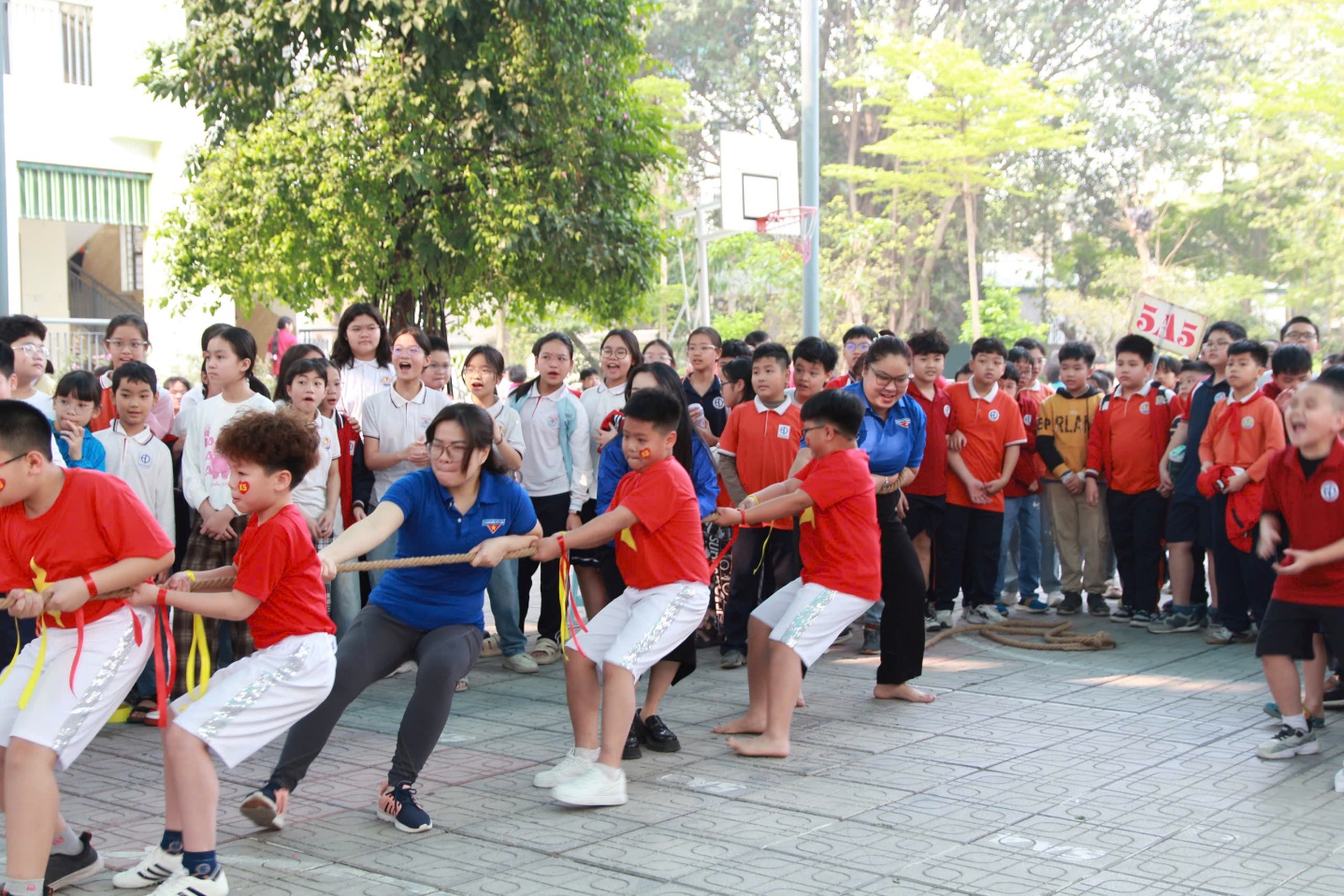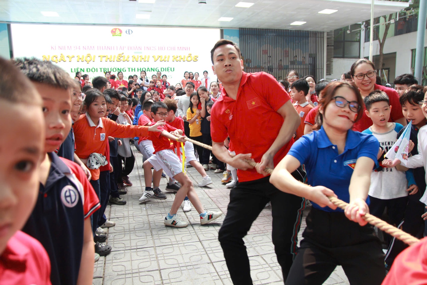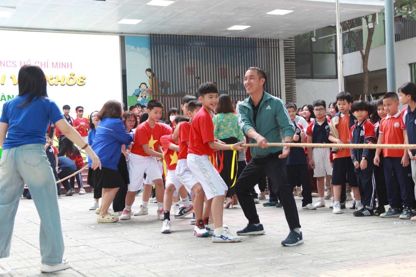 Không khí ngày hội càng trở nên bùng nổ khi bước vào phần thi kéo co của các thầy cô trong Chi đoàn nhà trường cùng các em học sinh khối 5. Những tiếng reo hò cổ vũ vang dội cả sân trường, tiếp thêm động lực cho các đội thi. Những màn tranh tài kịch tính giữa các đội đã mang đến những giây phút đầy cảm xúc, từ căng thẳng, hồi hộp đến vỡ òa trong niềm vui chiến thắng. Đây không chỉ là một trò chơi mà còn là bài học sâu sắc về tinh thần đồng đội và ý chí kiên trì.
