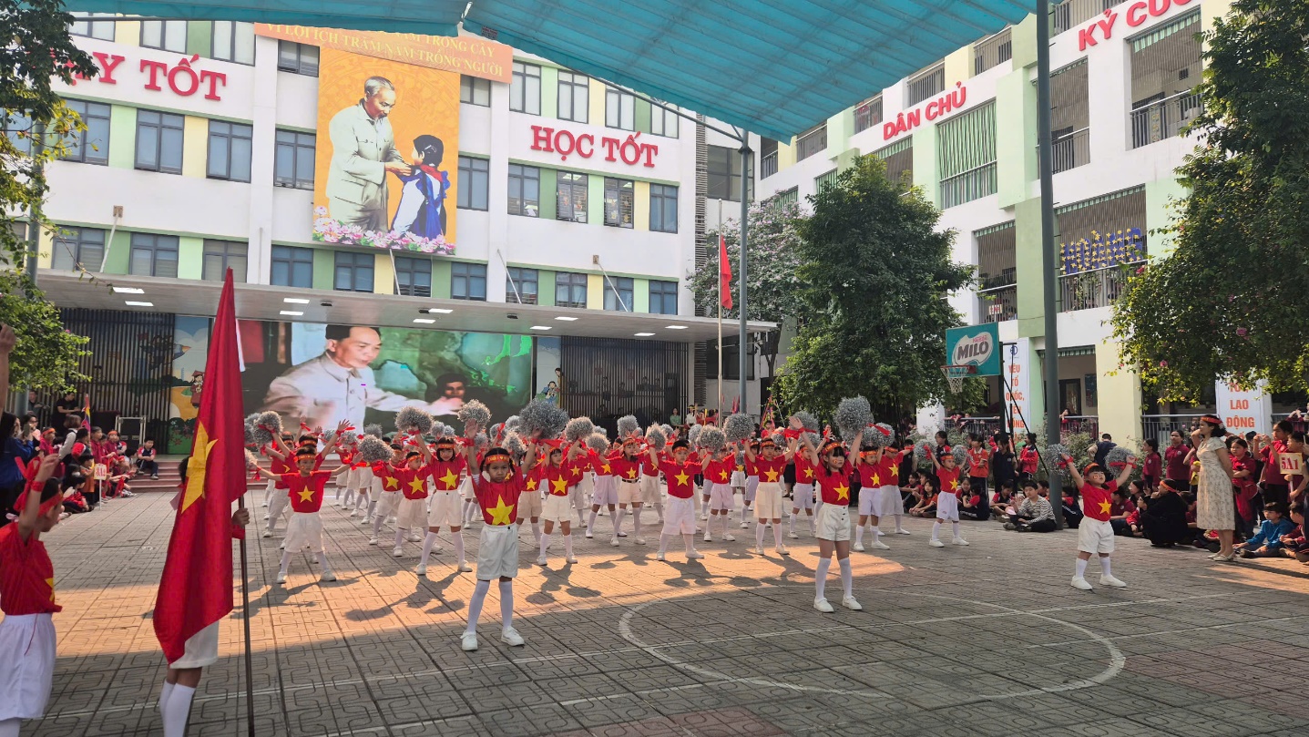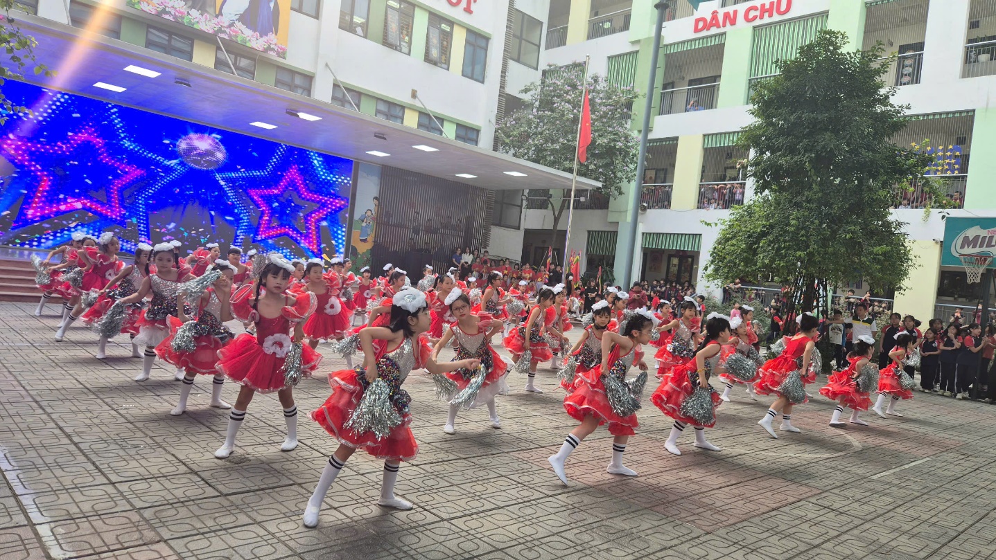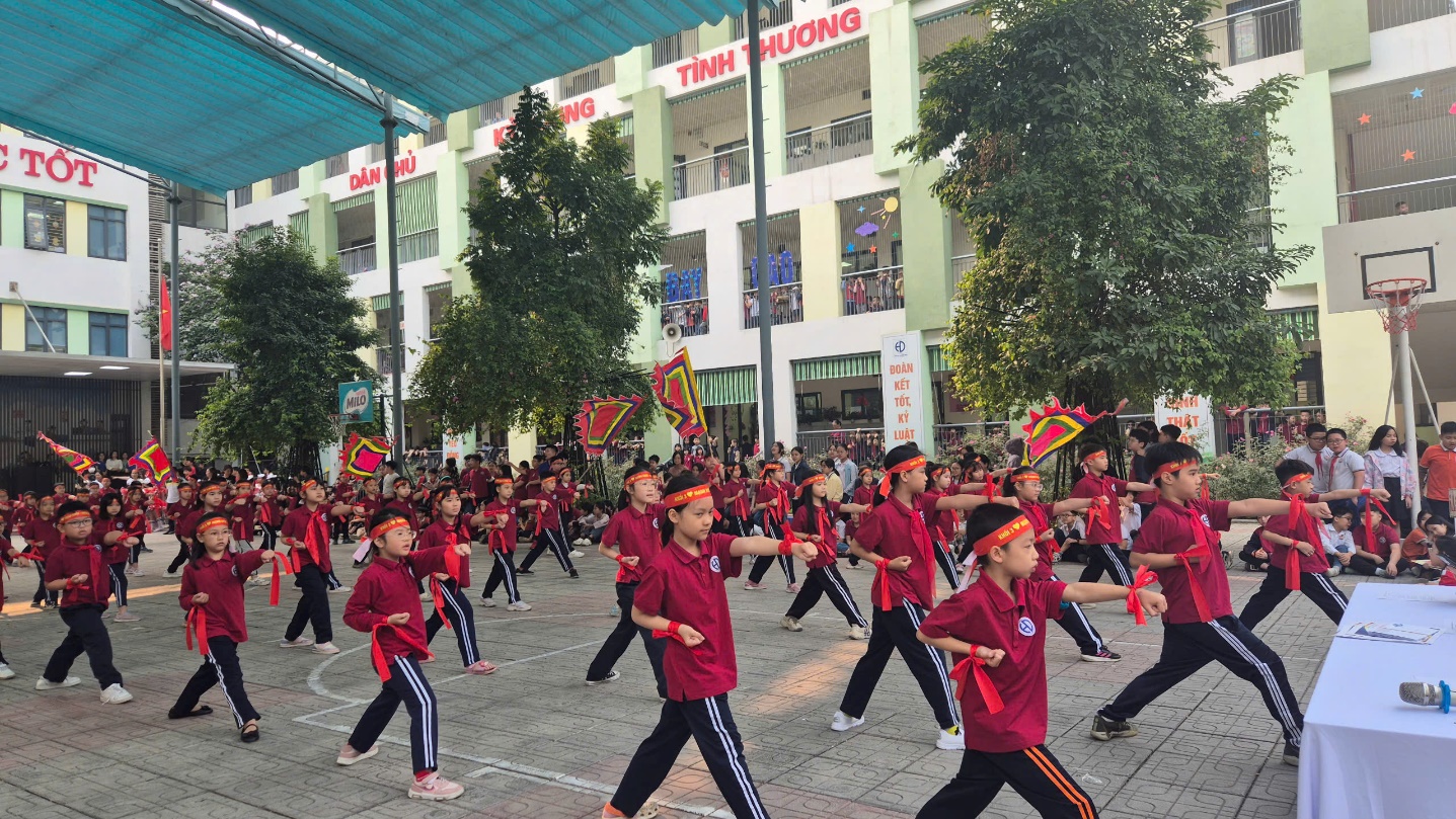 Khối 1, 2: Các em nhỏ mang đến những màn đồng diễn dễ thương, đáng yêu, tạo nên bầu không khí vui tươi, đầy năng lượng.