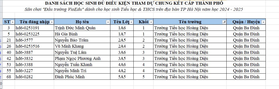 Trường Tiểu học Hoàng Diệu thông báo danh sách học sinh được duyệt tham dự sân chơi Đấu trường Vioedu cấp Thành phố năm học 2024 - 2025. Chúc các con ôn tập thật tốt và đạt kết quả cao trong kì thi sắp tới!