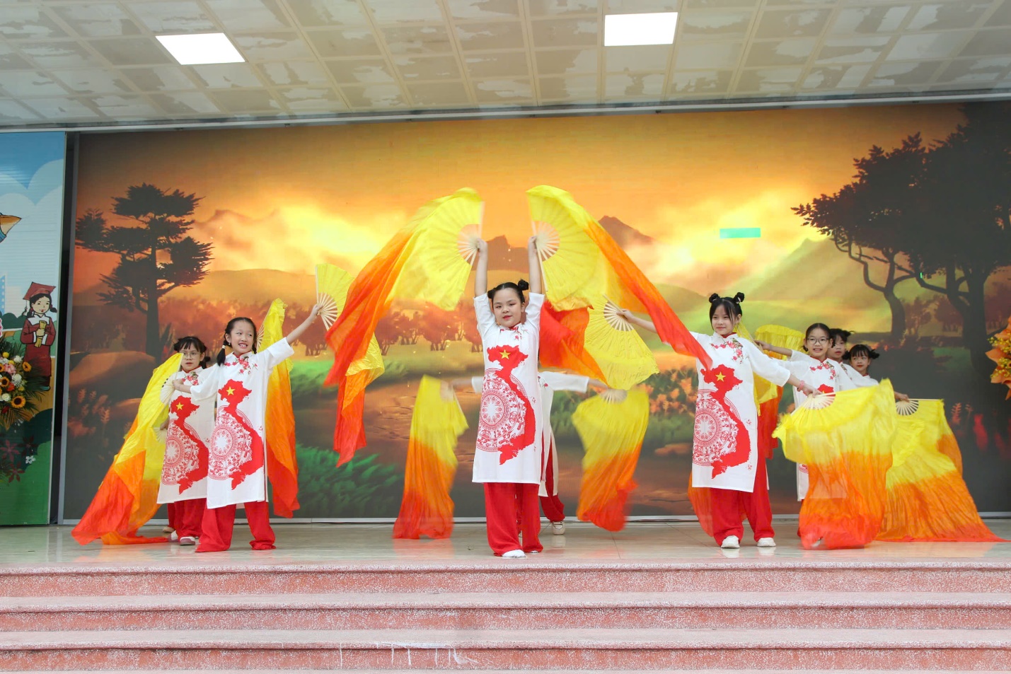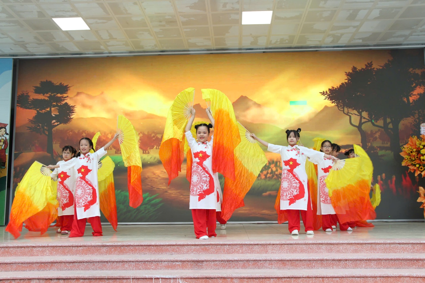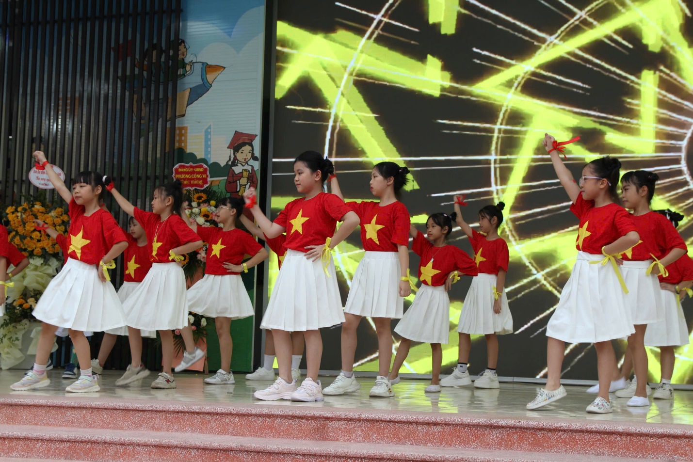 Đặc biệt ấn tượng là tiết mục mashup múa "Rực rỡ Việt Nam" kết hợp với bài nhảy “Năng động Việt Nam" của các con học sinh khối 4. Sự kết hợp độc đáo này không chỉ mang đến một tiết mục sôi động, mà còn thể hiện tình yêu quê hương đất nước của các em học sinh. Những bước nhảy uyển chuyển, những động tác mạnh mẽ, cùng với những trang phục áo cờ đỏ sao vàng đã tạo nên một bức tranh sinh động về vẻ đẹp Việt Nam.