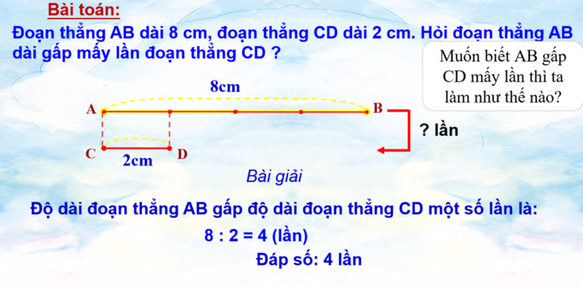 Ví dụ: Cho đoạn thẳng AB dài 8cm, đoạn thẳng CD dài 2cm. Hỏi đoạn thẳng AB gấp mấy lần đoạn thẳng CD?
