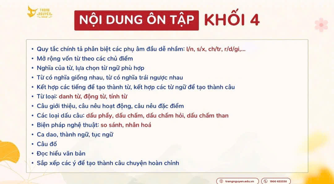 Nội dung ôn tập dành cho học sinh lớp 4 vòng thi Hương - cấp Quận sân chơi Trạng Nguyên Tiếng Việt năm học 2024 - 2025