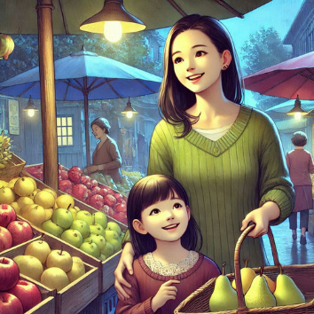 Nga cùng mẹ đi chợ ......mua.... lê.