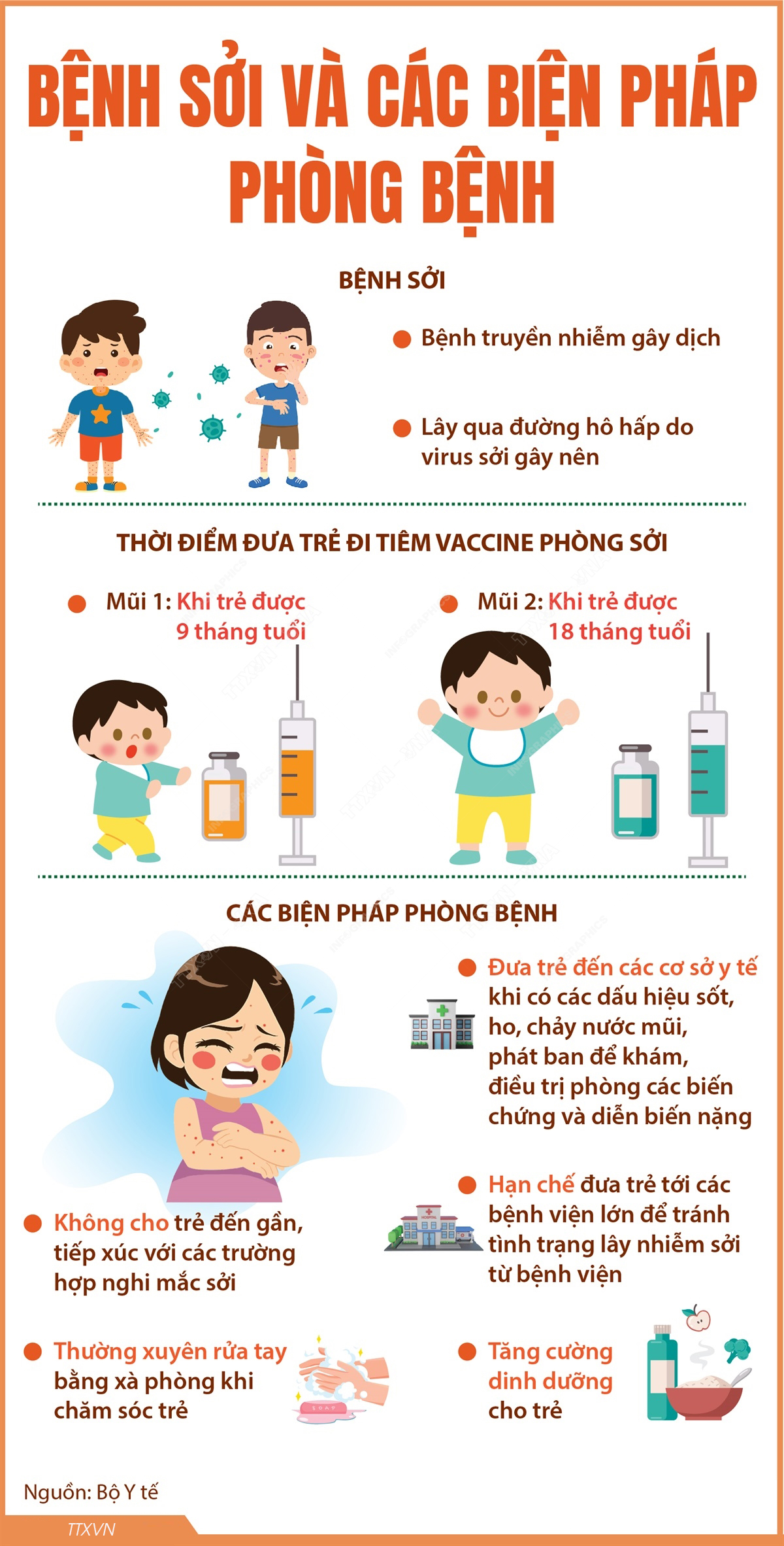 Bệnh sởi là một bệnh truyền nhiễm nguy hiểm gây ra bởi virus sởi và lây truyền qua đường hô hấp. Đưa trẻ đi tiêm phòng đúng độ tuổi, rửa tay bằng xà phòng trước khi tiếp xúc với trẻ, tránh tiếp xúc với người mắc bệnh/nghi mắc bệnh là những cách phòng chống bệnh sởi hữu hiệu.