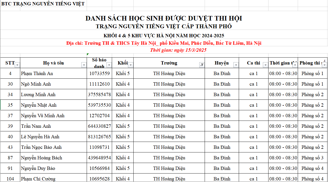 Nhằm đảm bảo công tác thi được diễn ra thuận lợi, BTC Trạng Nguyên Tiếng Việt gửi Qúy Phụ huynh và các con học sinh danh sách thí sinh được chia theo ca thi và phòng thi (Chi tiết bên dưới) hoặc xem trực tiếp tại:https://bit.ly/danhsachthiHN