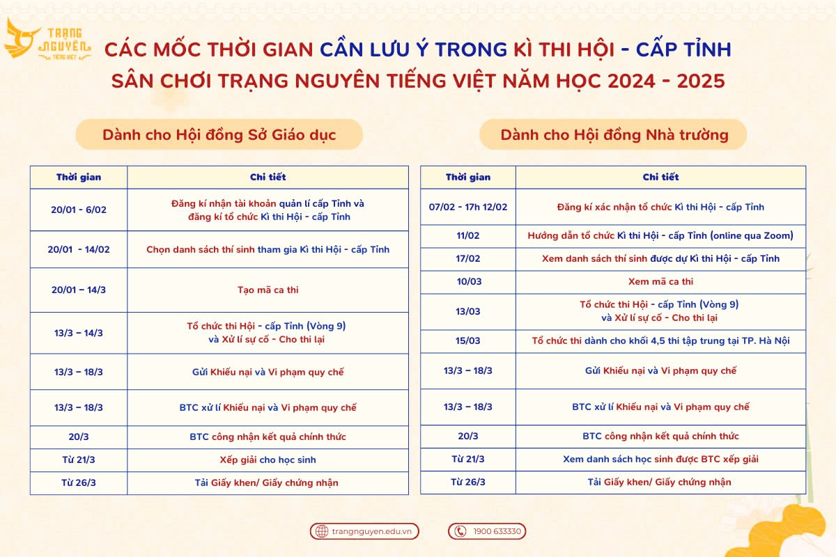 Kỳ thi Hội - cấp Tỉnh sân chơi Trạng Nguyên Tiếng Việt năm học 2024 – 2025 đang đến gần! Để kỳ thi diễn ra suôn sẻ và đạt kết quả tốt nhất, quý thầy cô, các bậc phụ huynh và các con học sinh hãy theo dõi và lưu ý các mốc thời gian quan trọng dưới đây.