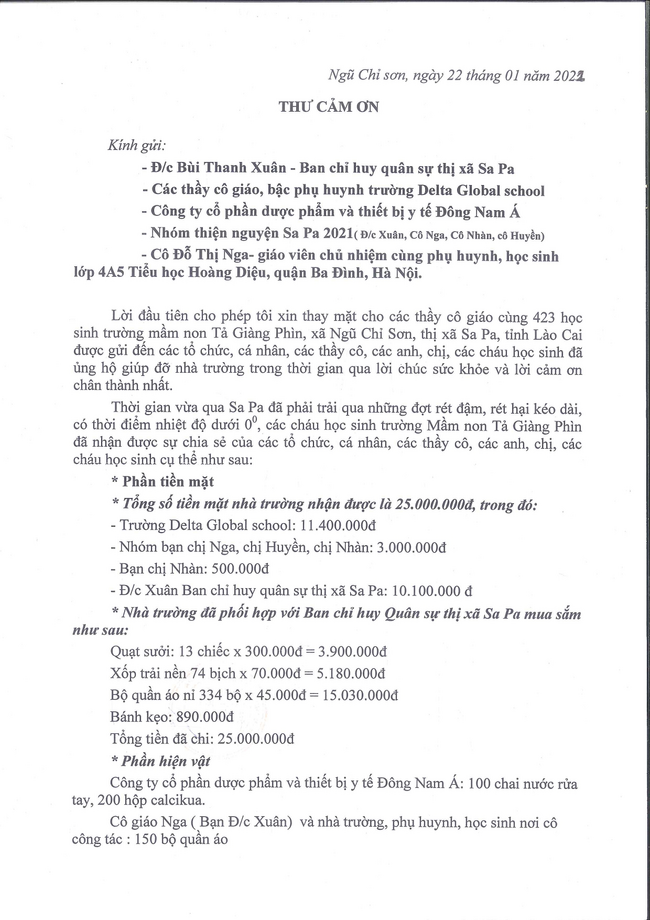 Ngày 14 tháng 8 năm 2021, khi dịch covid bùng phát, Hà Nội giới nghiêm toàn thành phố. Thông qua mạng xã hội, cô Nga nắm được thông tin gia đình học sinh Nguyễn Như Quỳnh lớp 4A5 do cô chủ nhiệm năm học 2020 – 2021 gặp khó khăn về tài chính và lương thực, nên đã kêu gọi Phụ huynh trong lớp chung tay giúp đỡ được tổng số tiền 13 100 000 đồng, cùng các nhu yếu phẩm gạo, mì, đồ khô,….
