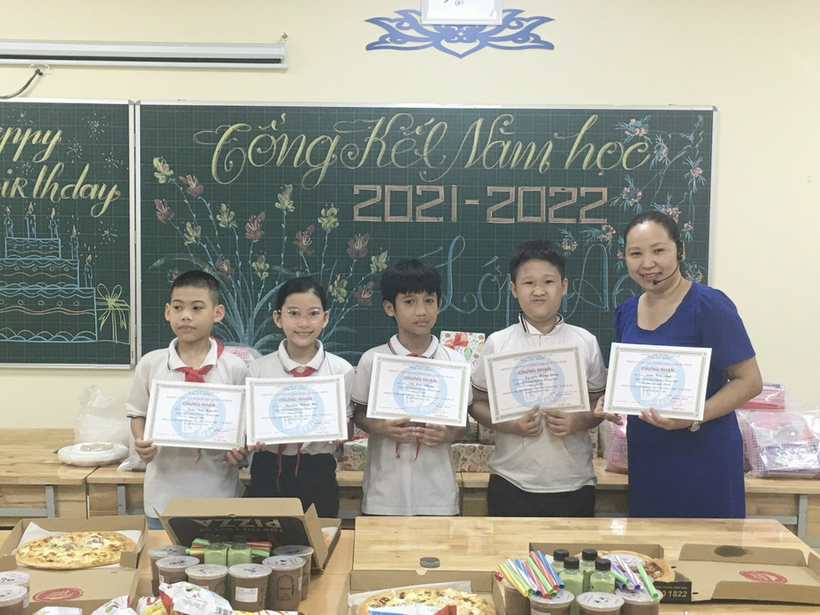 Cô Đỗ Thị Nga trao thưởng cho những học sinh đạt thành tích cao của lớp mình trong cuộc thi Trạng nguyên Tiếng Việt, Giải toán qua mạng internet cấp quận và Thành phố.