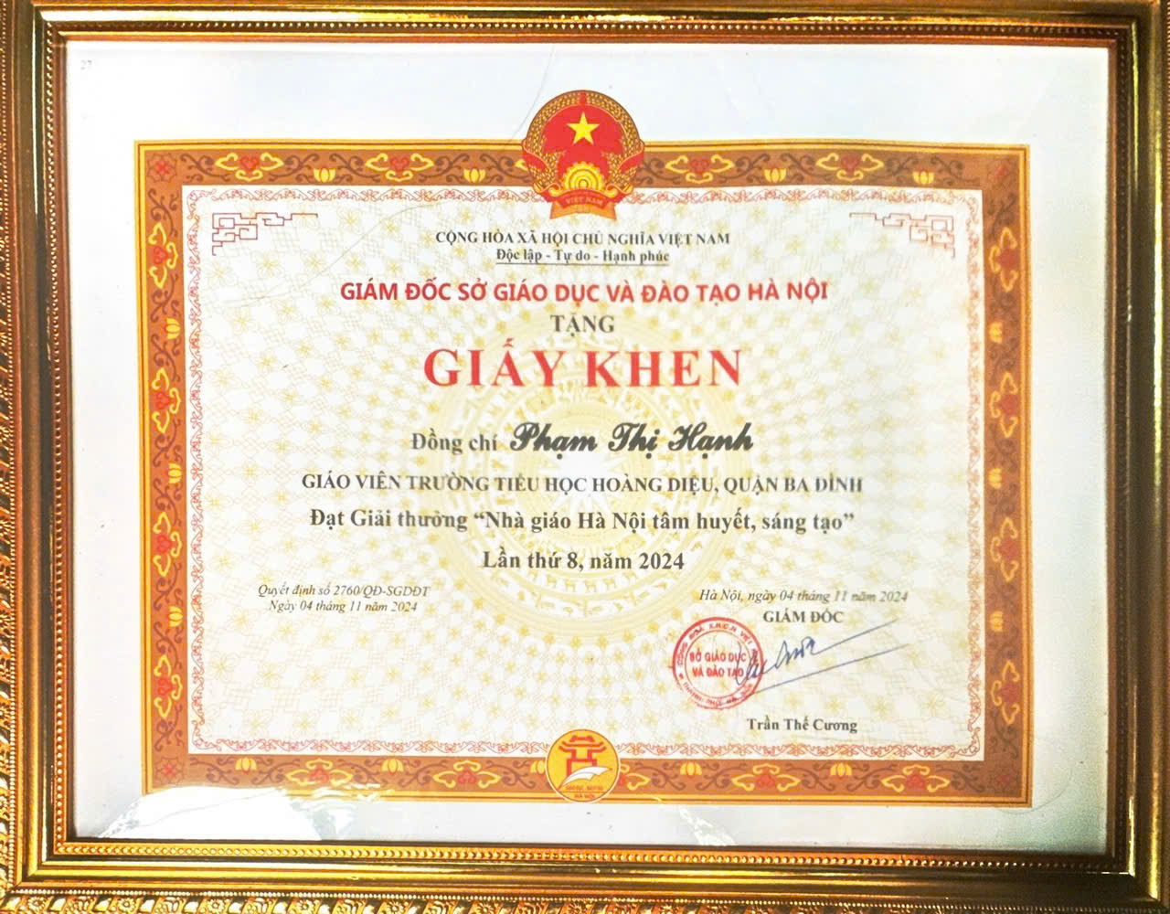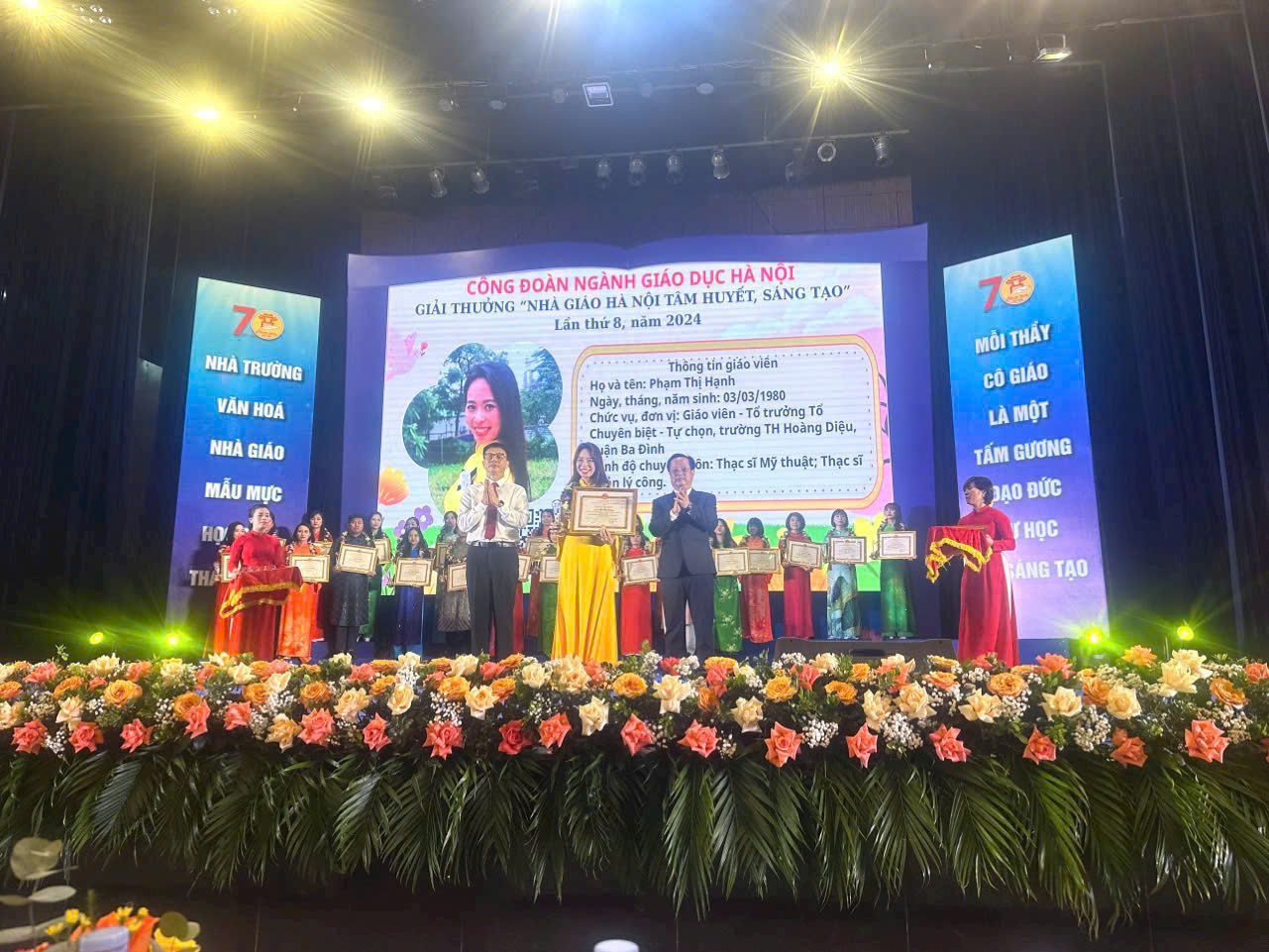 Ngày 14/11, Sở GD&ĐT Hà Nội tổ chức trao giải thưởng nhà giáo Hà Nội tâm huyết sáng tạo năm 2024. Cô giáo Phạm Thị Hạnh – Giáo viên Mỹ thuật, trường Tiểu học Hoàng Diệu vinh dự là 1 trong 196 nhà giáo tiêu biểu được nhận giải thưởng.