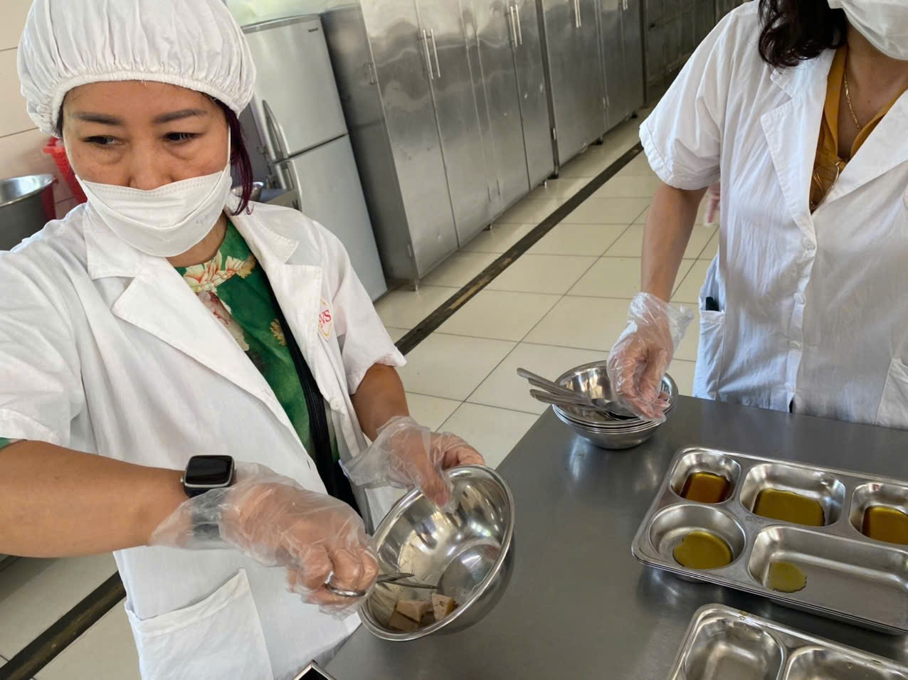 3. Quy trình chế biến suất ăn và vệ sinh đồ dùng nhà bếp: Đoàn y tế đã kiểm tra qui trình chế biến xuất ăn của nhà bếp và xét nghiệm ngẫu nhiên dụng cụ nấu nướng, đồ dùng phục vụ xuất ăn cho học sinh (khay đựng, bát, thìa…). Đoàn nhận xét: Qui trình chế biến xuất ăn đảm bảo VS ATTP ; xét nghiệm 10 mẫu khay ăn của học sinh – Kết quả đạt yêu cầu 10/10.