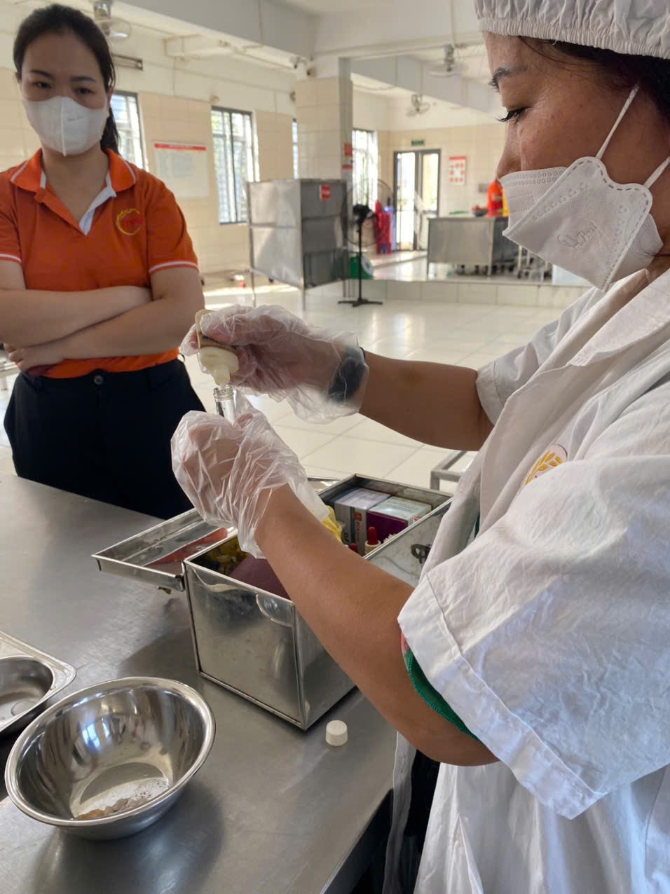 2. Nguồn gốc thực phẩm, nguyên liệu nhập vào bếp ăn: Với đội ngũ được phân công theo lịch hàng ngày gồm: BGH, giáo viên, nhân viên giám sát, y tế nhà trường, đặc biệt có sự tham gia của đại diện phụ huynh trường đã thực hiện việc kiểm tra thực phẩm đầu vào chặt chẽ, đúng qui định. Đảm bảo thực phẩm, nguyên liệu nhập vào bếp không chỉ đủ khối lượng, đúng chủng loại, rõ nguồn gốc, xuất xứ, hạn sử dụng mà cảm quan phải luôn tươi, ngon. Đoàn kiểm tra thực hiện xét nghiệm tại chỗ 10 mẫu xuất ăn – Kết quả 10/10 mẫu đạt tiêu chuẩn.