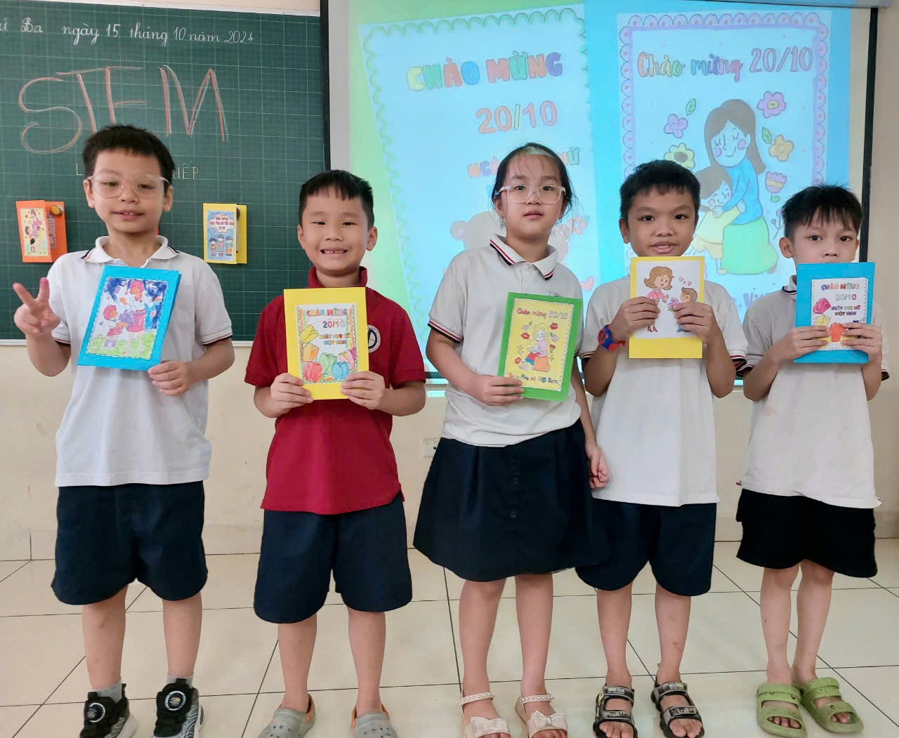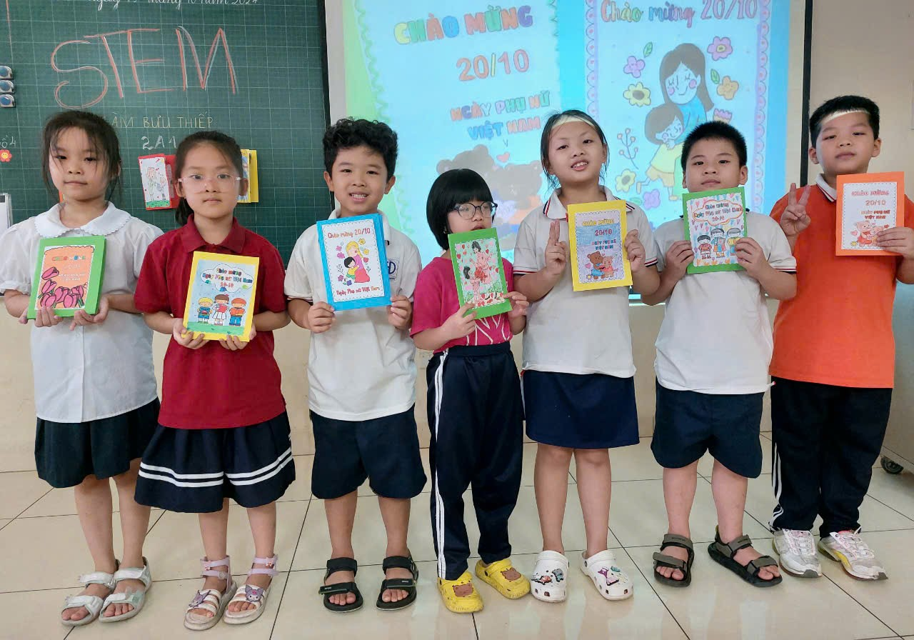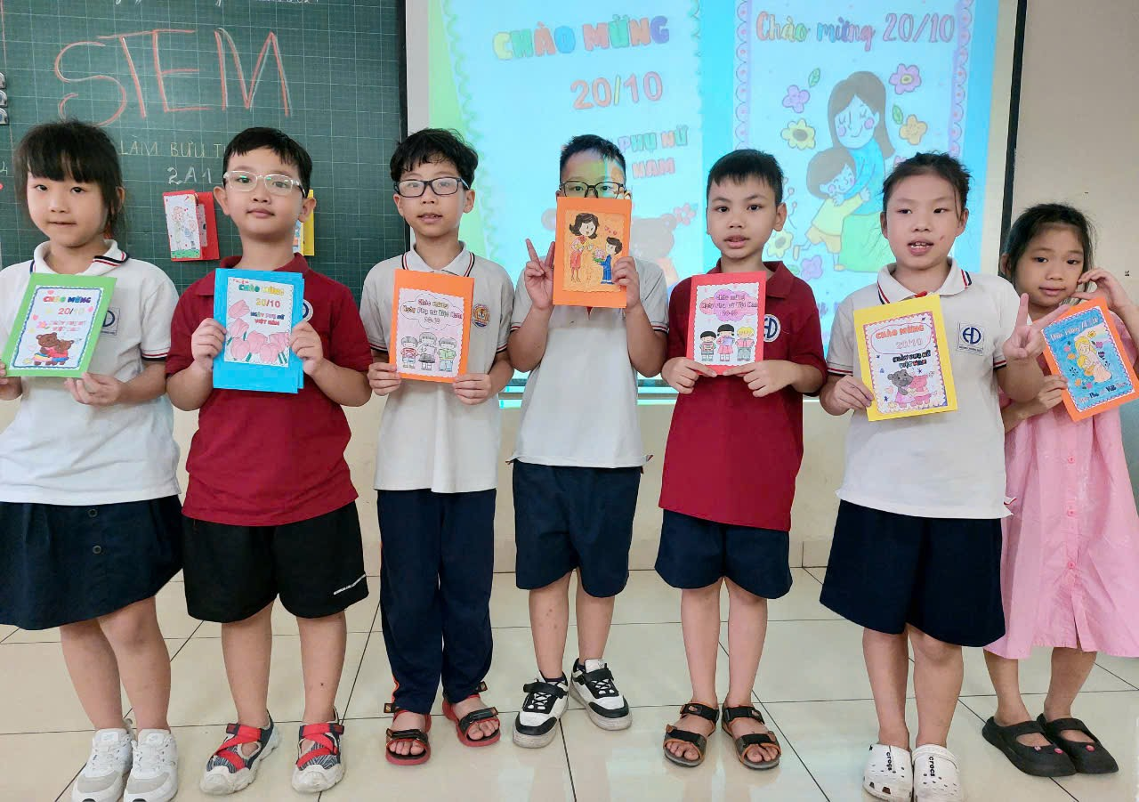 Nhân dịp ngày Phụ nữ Việt Nam 20/10 tập thể lớp 2A1 đã được trải nghiệm làm thiệp chúc mừng trong tiết học Stem. Chỉ bằng những vật liệu đơn giản như kéo, giấy, bút màu,.. các bạn đã có thể thoải mái vẽ theo trí tưởng tượng của mình, tạo ra một tấm thiệp độc đáo.