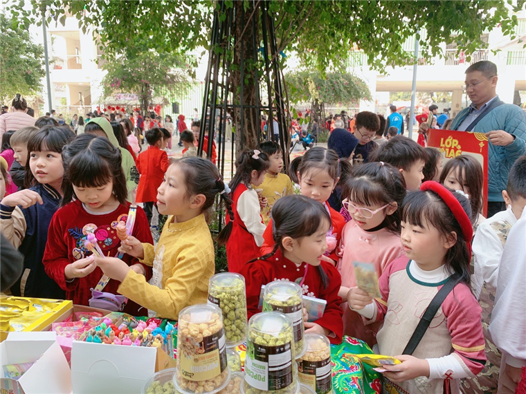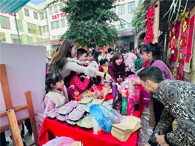 Không chỉ vậy, các thầy cô và phụ huynh cũng tham gia hỗ trợ các em, cùng hướng dẫn và động viên để các em tự tin hơn. Gian hàng Tết không chỉ là nơi vui chơi mà còn là cơ hội để các bạn nhỏ hiểu thêm về truyền thống văn hóa ngày Tết Việt Nam, về tình yêu thương và sự sẻ chia trong cộng đồng.