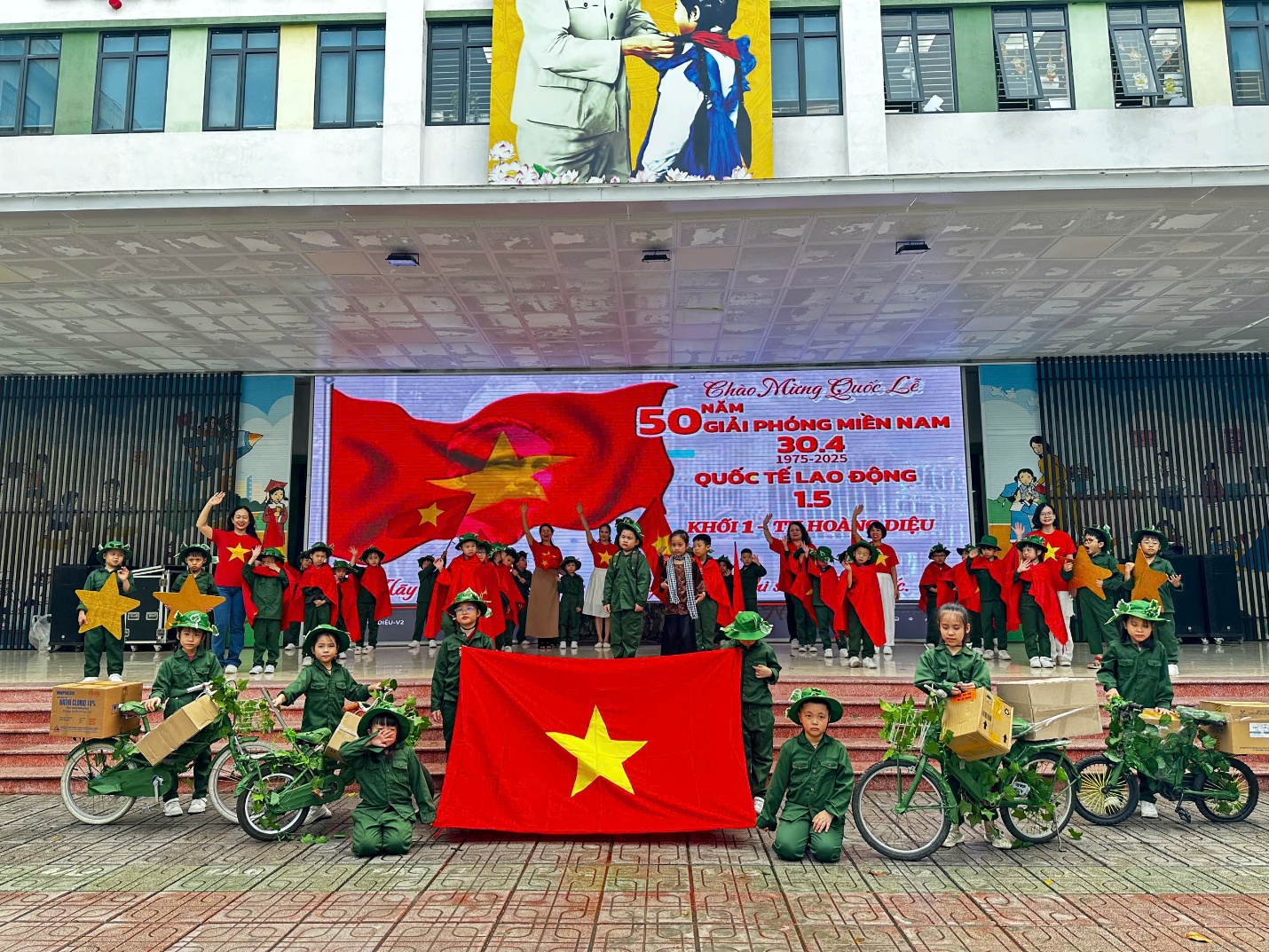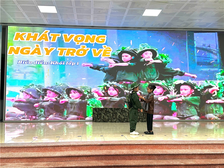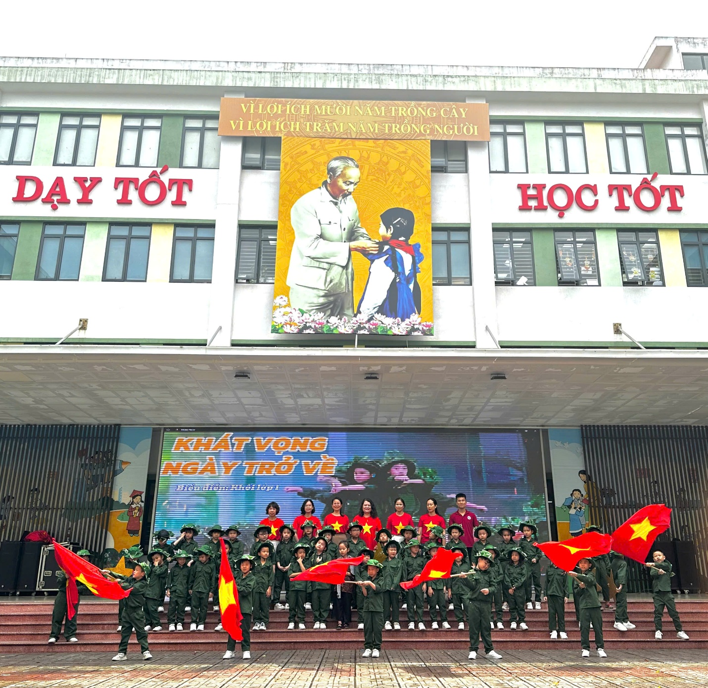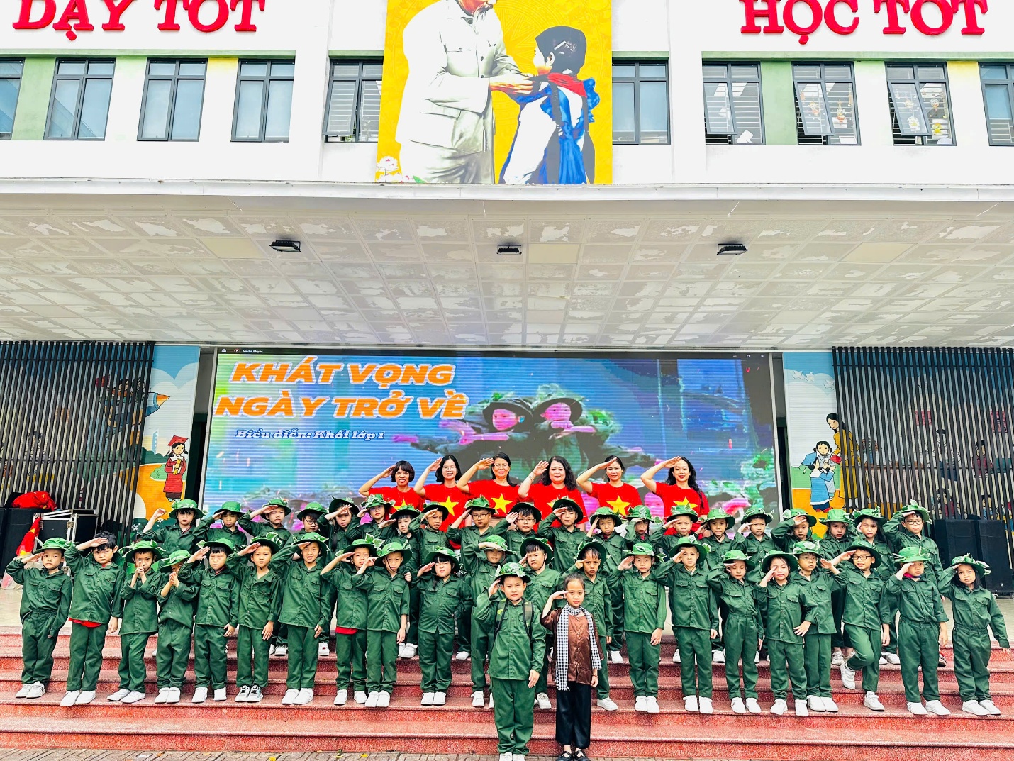 Ngày 29/4 vừa qua, tại trường tiểu học Hoàng Diệu, các bạn học sinh khối 1 đã cùng nhau thể hiện tiết mục hoạt cảnh đầy ý nghĩa với bài hát "Khát vọng ngày trở về". Buổi biểu diễn không chỉ là một món quà tinh thần mà còn là dịp để các em nhỏ thể hiện niềm yêu quê hương, đất nước và khát khao cống hiến cho sự nghiệp bảo vệ và xây dựng Tổ quốc.