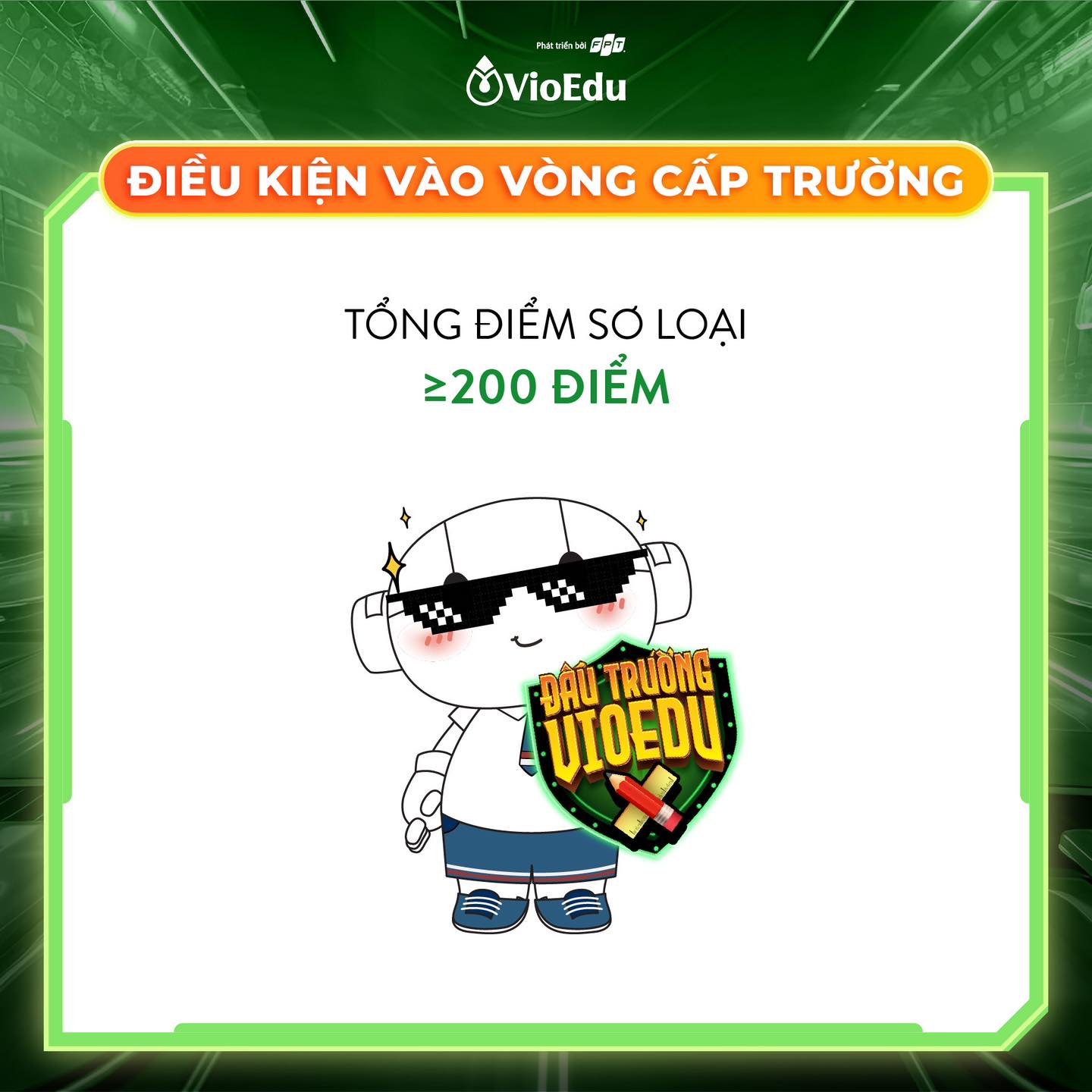 - Các vòng sơ loại sẽ diễn ra liên tục từ thứ 7 đến hết thứ 6 tuần tiếp theo cho tới khi hết 10 vòng.Điểm điều kiện để vào vòng cấp trường là học sinh đạt tối thiểu 150 điểm/10 vòng- tổng 300 câu, mỗi câu đúng 1 điểm ( Chỉ xét tổng điểm không xét số vòng tham dự)