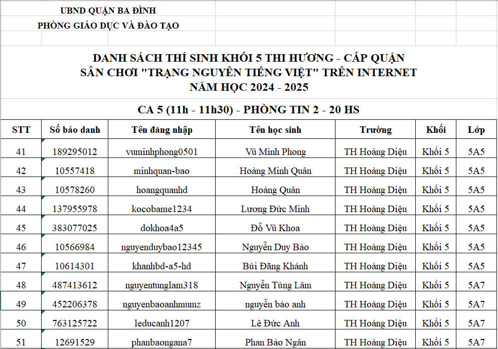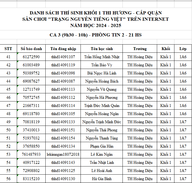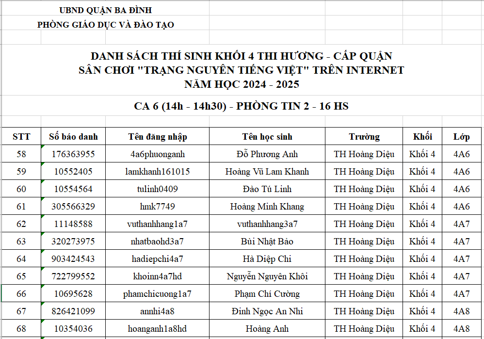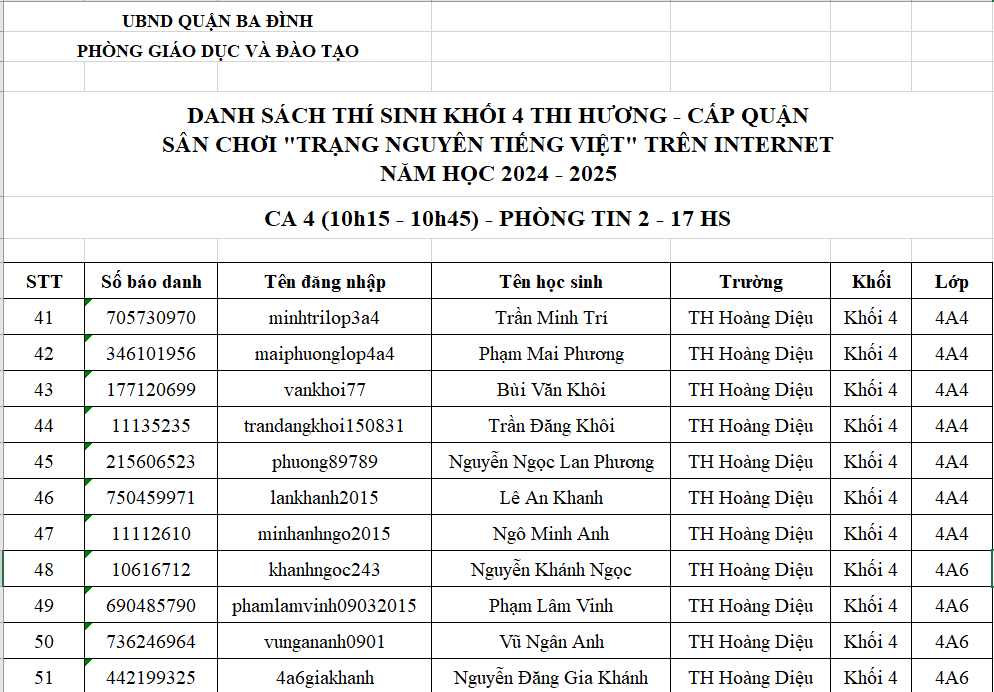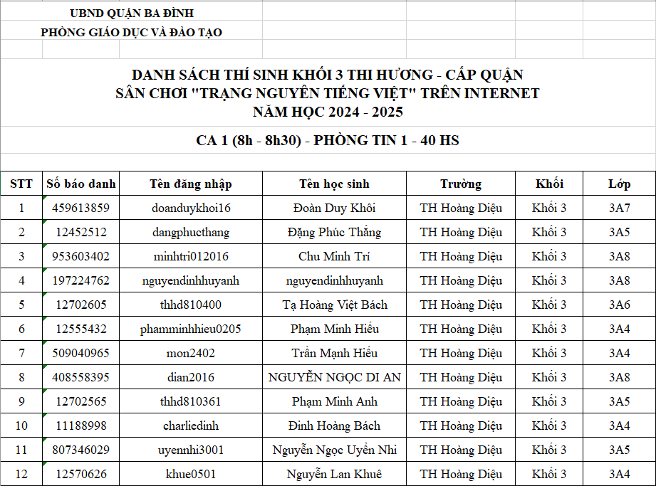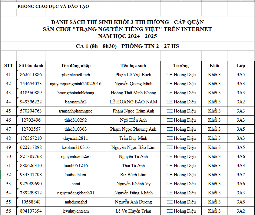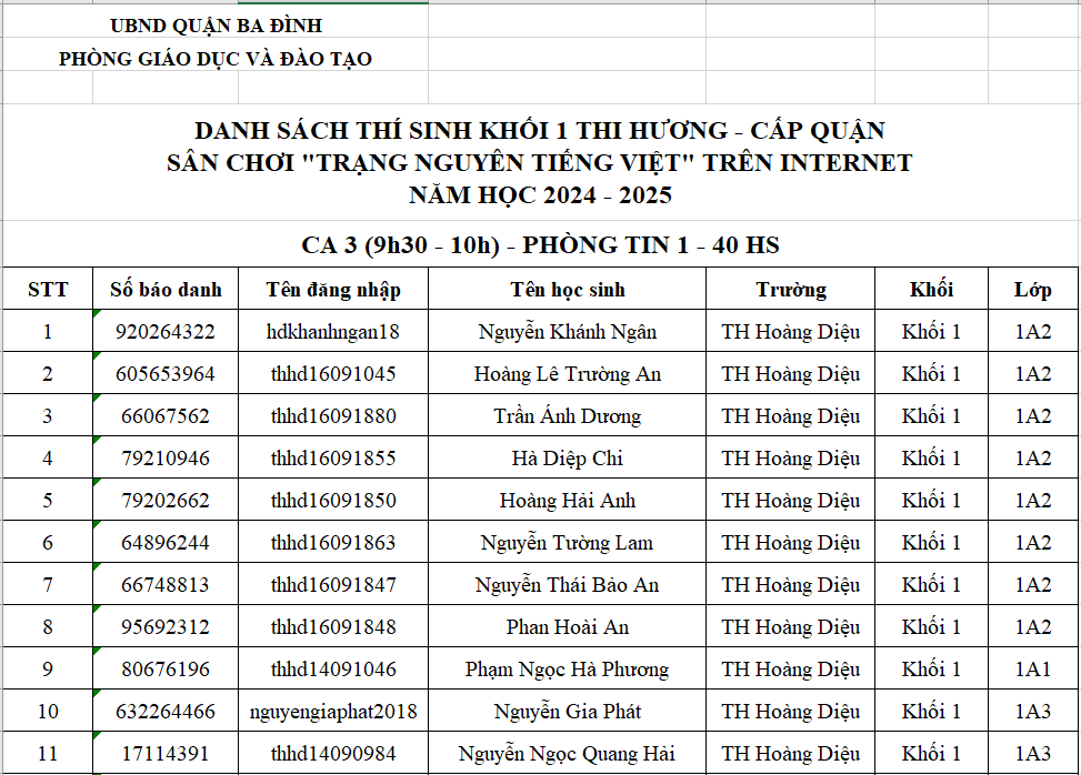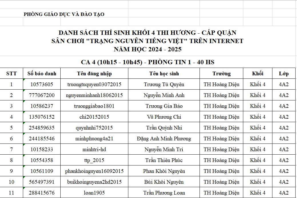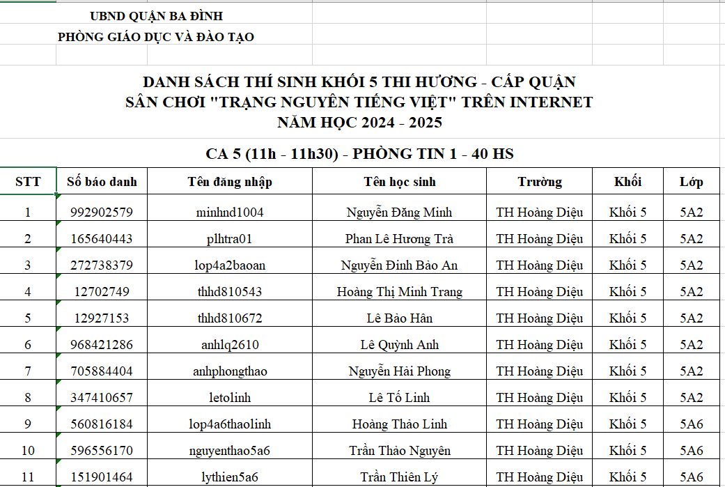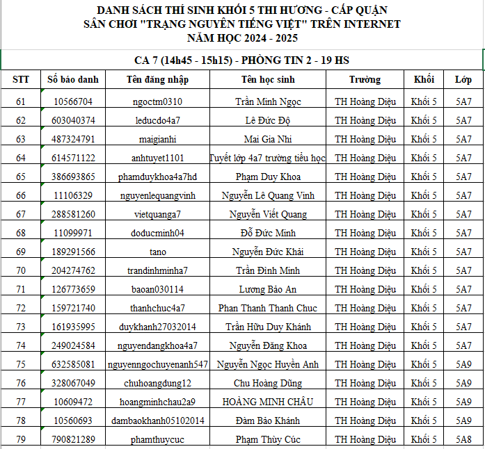 7. Danh sách học sinh tham dự vòng thi Hương cấp Quận sân chơi Trạng Nguyên Tiếng Việt năm học 2024 - 2025