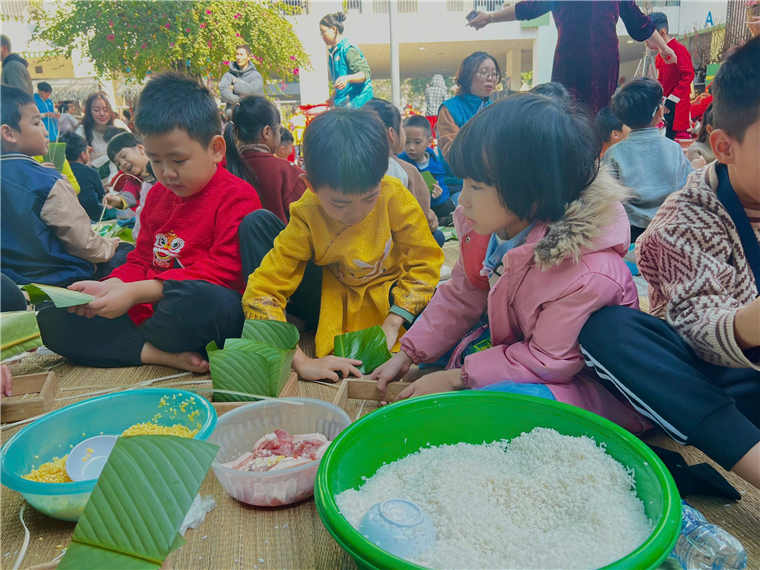 Buổi sáng, sân trường rộn ràng tiếng cười nói của các bạn nhỏ. Các cô giáo và phụ huynh đã chuẩn bị sẵn sàng các nguyên liệu như lá dong, gạo nếp, đậu xanh, thịt lợn, dây lạt,... Các bạn nhỏ được cô giáo hướng dẫn cách chọn lá dong xanh mướt, cách gấp lá sao cho vuông vắn, và cách đặt gạo, đậu, thịt vào giữa để tạo thành chiếc bánh hoàn chỉnh.