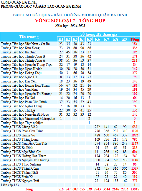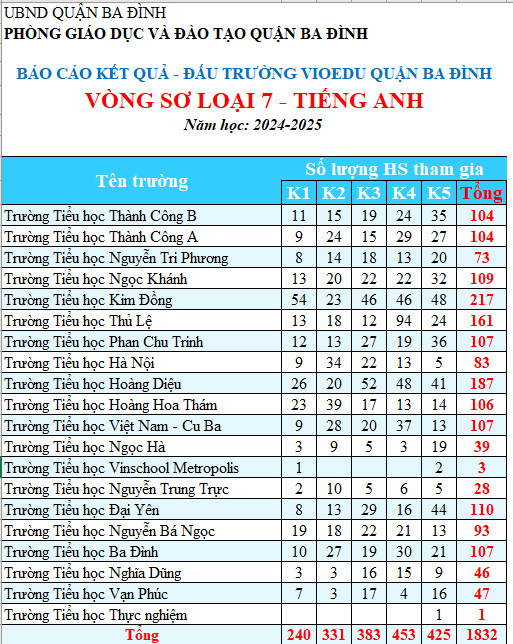 BTC xin gửi BXH KẾT QUẢ VÒNG SƠ LOẠI 07 - Đấu trường Toán học và Tiếng Anh Quận Ba Đình