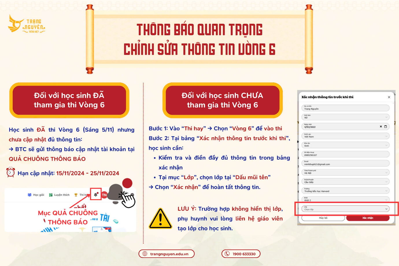 🌟 Đối với thí sinh đã thi vòng 6 vào ngày 5/11, cần kiểm tra mục quả chuông thông báo và chỉnh sửa thông tin LỚP tại mục “Thông tin cá nhân”.