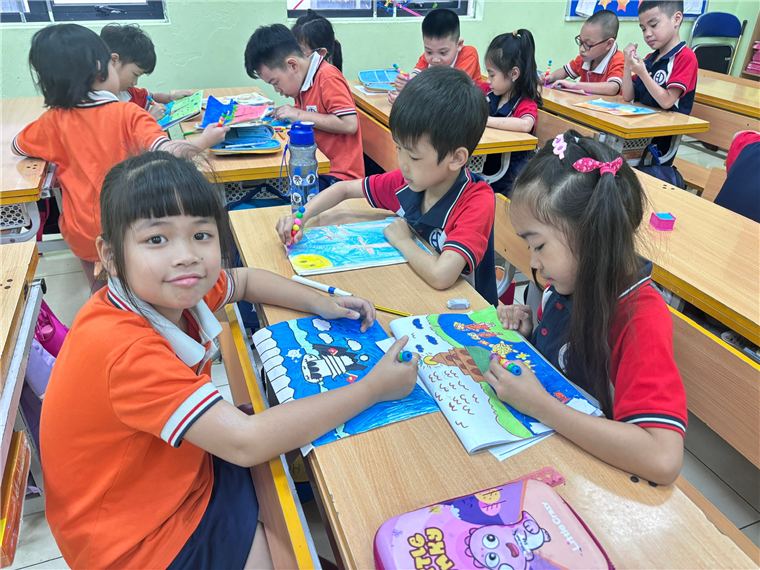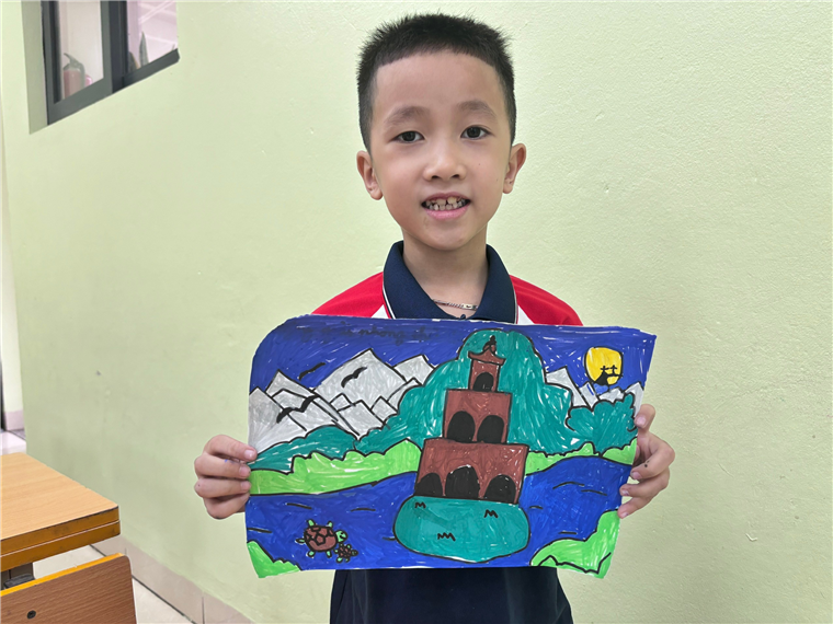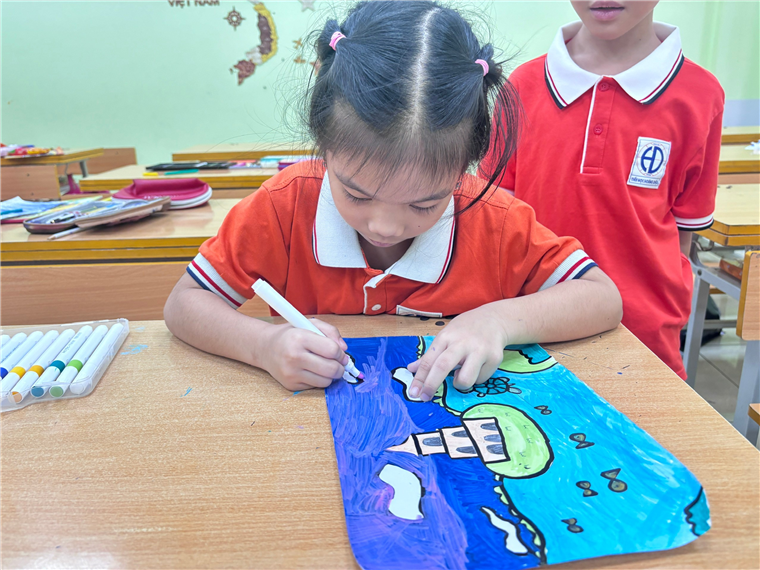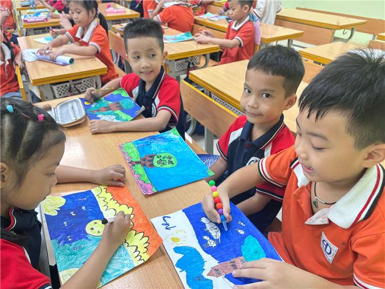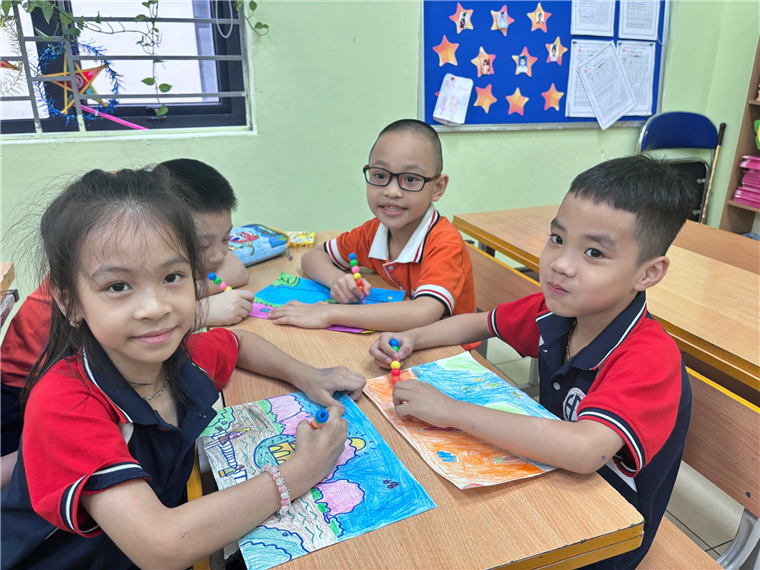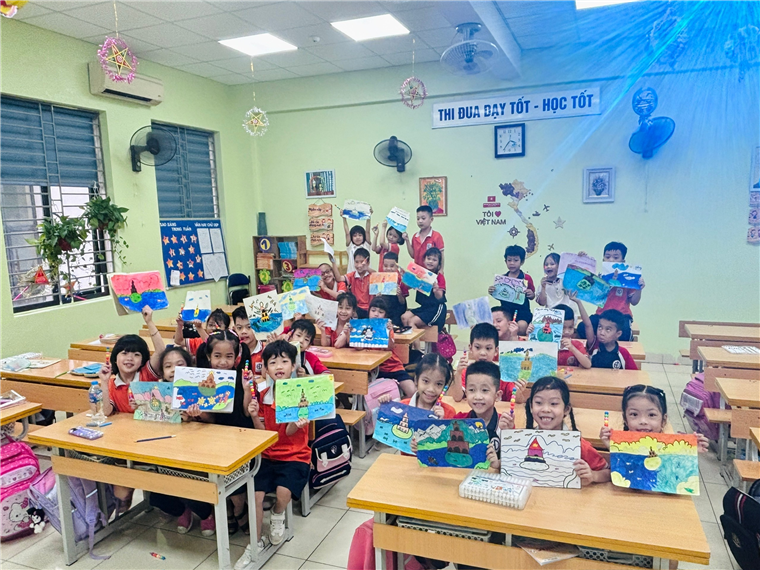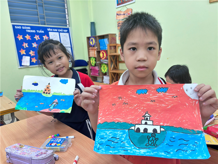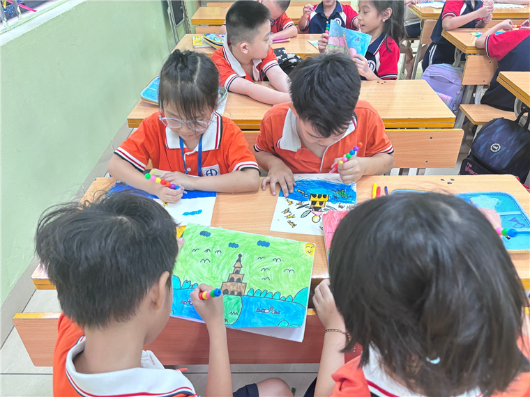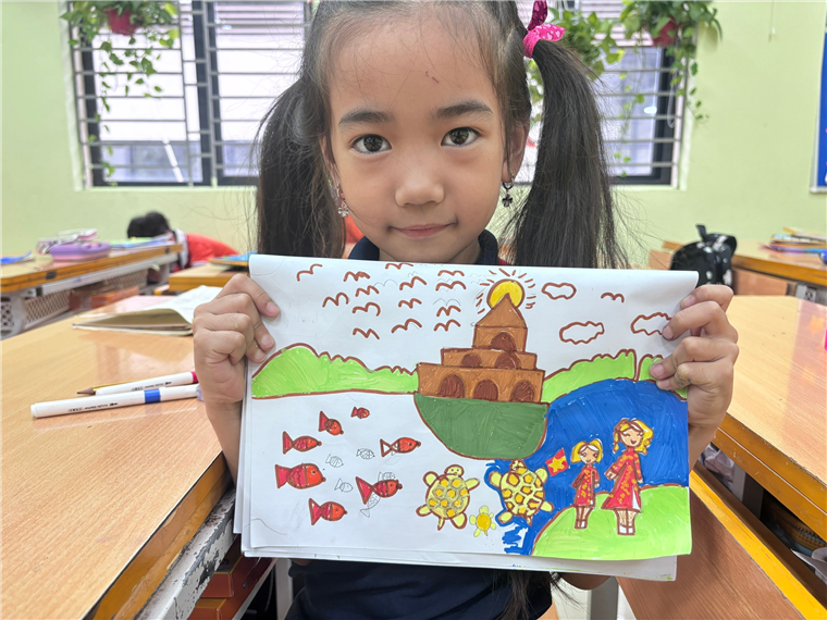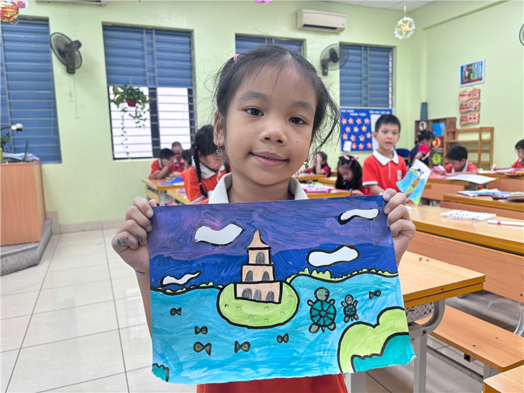 Tiết học vẽ trải nghiệm thường mang đến cho học sinh cơ hội thể hiện sáng tạo và khám phá khả năng nghệ thuật của bản thân. Trong tiết học này, các bạn nhỏ lớp 2A8 đã được tìm hiểu về những danh lam thắng cảnh của Hà Nội, trong đó có Hồ Gươm qua hoạt động vẽ tranh. Hoạt động vừa giúp học sinh sáng tạo, khám phá khả năng nghệ thuật vừa hiểu thêm về lịch sử, thêm yêu lịch sử Việt Nam.