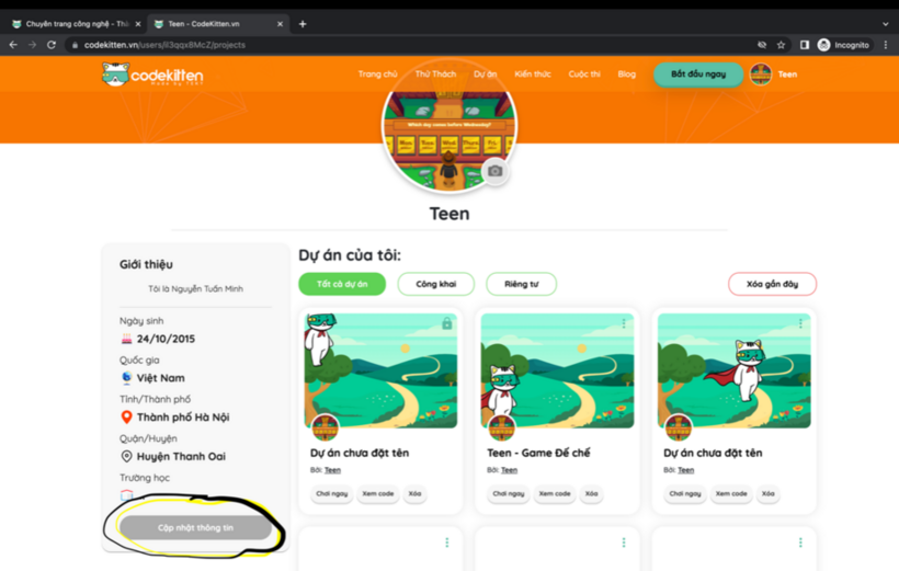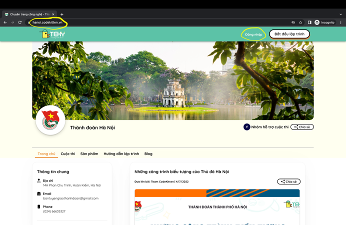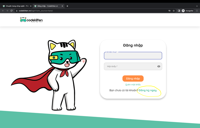 - Truy cập website https://hanoi.codekitten.vn/, bấm “Đăng nhập”, và đăng nhập bằng tài khoản cá nhân đã có.