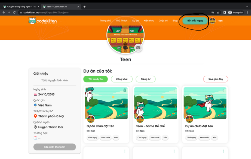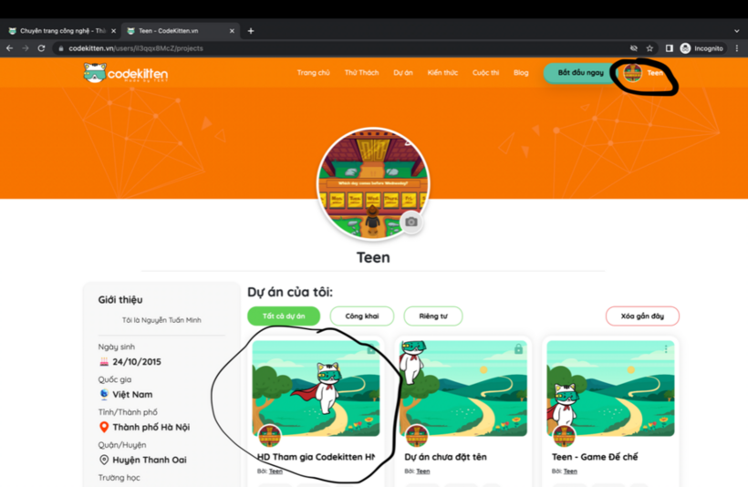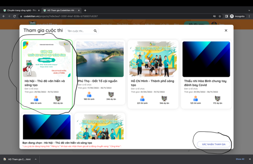 - Về lại trang “Tài khoản cá nhân”, bấm chọn dự án mình muốn để tham gia cuộc thi