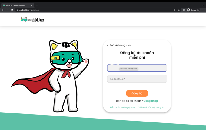 Bước 1: Đăng kí tài khoản trên nền tảng Codekitten.vn (nếu chưa có tài khoản):