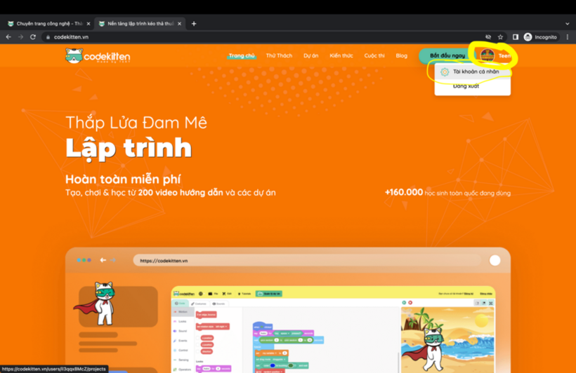 - Bước1: Đăng kí tài khoản trên nền tảng Codekitten.vn (nếu chưa có tài khoản).