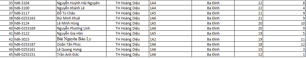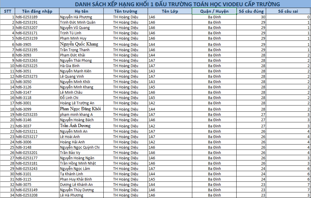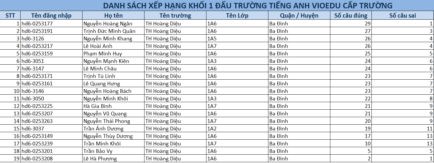 BTC cuộc thi VioEdu Trường Tiểu học Hoàng Diệu xin thông báo kết quả vòng thi cấp trường của Đấu trường Toán học và Tiếng Anh – VioEdu dành cho Khối 1.