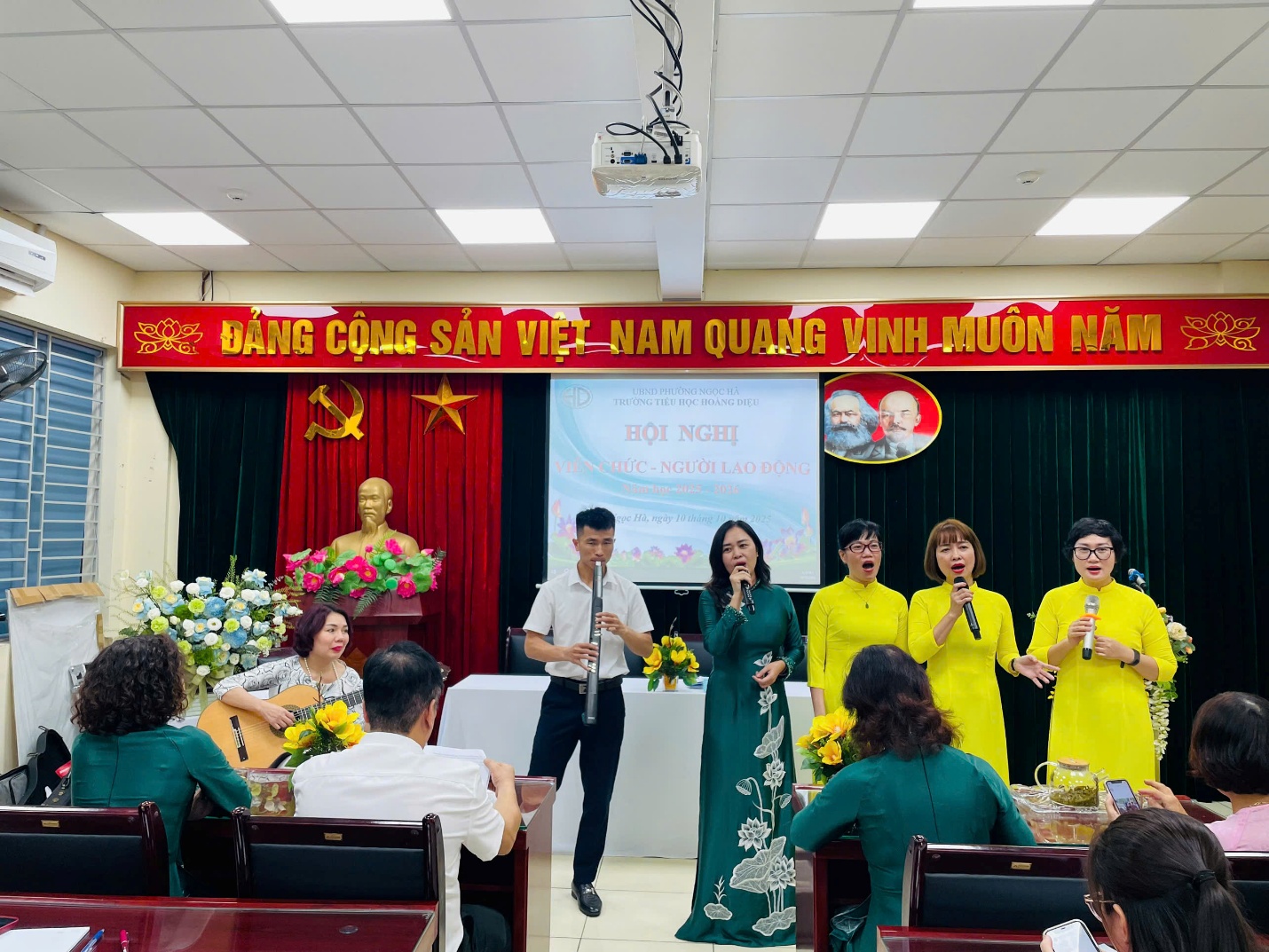 Mở đầu chương trình là tiết mục văn nghệ chào mừng đặc sắc do chính các thầy cô giáo tài năng của Trường Tiểu học Hoàng Diệu biểu diễn. Với giai điệu rộn ràng, tươi vui và tinh thần nhiệt huyết, các thầy cô đã mang đến không khí hứng khởi, tràn đầy năng lượng cho hội nghị. Tiết mục không chỉ thể hiện tinh thần đoàn kết, sáng tạo của đội ngũ nhà giáo mà còn là lời gửi gắm niềm tin, quyết tâm cùng nhau vượt qua khó khăn, hoàn thành xuất sắc nhiệm vụ trong năm học mới.