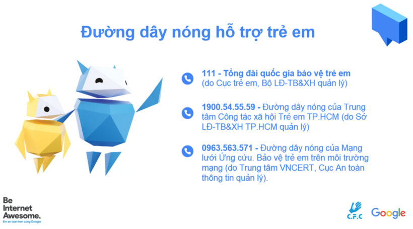 Chúng ta không thể cấm trẻ sử dụng internet, nhất là trong thời đại 4.0, nhưng bố mẹ và nhà trường cần đồng hành, định hướng và bảo vệ các bạn nhỏ trên không gian mạng để các bạn kết nối an toàn, và những hoạt động này cần đến với nhiều bạn nhỏ hơn để tất cả các bạn nhỏ trên thế gới đều được an toàn khi sử dụng mạng Internet.