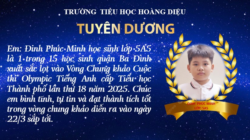 Chúc mừng em Đinh Phúc Minh học sinh lớp 5A5 là 1 trong 15 học sinh quận Ba Đình xuất sắc lọt vào Vòng Chung khảo Cuộc thi Olympic Tiếng Anh cấp Tiểu học Thành phố lần thứ 18 năm 2025.