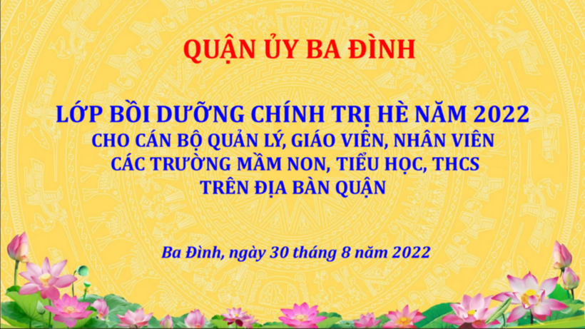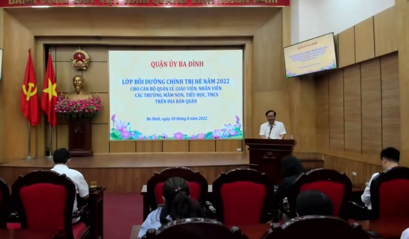Ngày 30/8/2022, Trung tâm chính trị phối hợp với Ban Tuyên giáo Quận uỷ, Phòng GDĐT quận tổ chức lớp Bồi dưỡng giáo dục lý luận chính trị hè năm 2022 cho cán bộ quản lý, giáo viên, nhân viên các cơ sở giáo dục trên địa bàn quận. Lớp học có sự tham gia của Đồng chí Nguyễn Công Thành - Phó Bí thư thường trực Quận uỷ; Đồng chí Phạm Thị Diễm - Quận ủy viên - Phó Chủ tịch UBND quận; Đồng chí Nguyễn Trung Dũng - Ủy viên Thường vụ Quận ủy - Phó Chủ tịch UBND quận; Đồng chí Hoàng Ngọc Sáu - Uỷ viên Thường vụ - Trưởng Ban Tuyên giáo quận Ba Đình; Đồng chí Lê Đức Thuận - Quận ủy viên - Trưởng phòng Giáo dục và Đào tạo quận; các đồng chí là trưởng các cơ quan, đơn vị cùng toàn thể cán bộ quản lí, giáo viên, nhân viên của các cơ sở giáo dục trên địa bàn quận.
