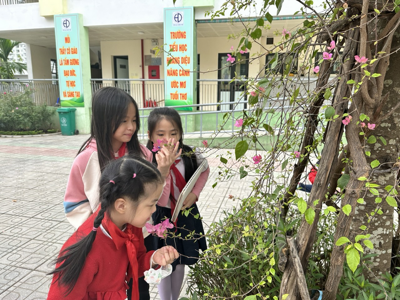Một vài em thì “mọc rễ” bên cây hoa giấy đang nở rộ, đặt cho cô rất nhiều câu hỏi. Các em nhận xét rằng là hoa giấy nên lá mỏng như giấy và mỗi cánh hoa mang hình chiếc lá còn mỏng hơn cả giấy. Có em còn thốt lên : “Hoa giấy là loài hoa có sắc không hương nhưng nó không cần hương vì sắc của nó đã đẹp rực rỡ lắm rồi”.