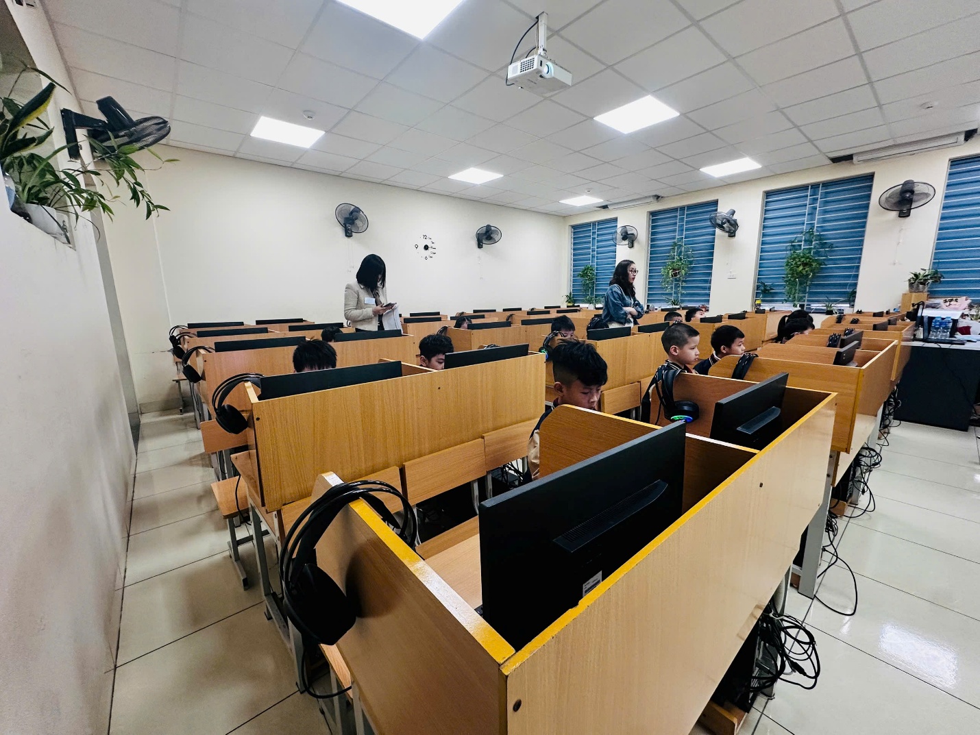 Ngay từ sáng sớm, không khí tại trường đã trở nên rộn ràng hơn bao giờ hết. Các thí sinh nhí mặc đồng phục gọn gàng, trên gương mặt lộ rõ sự háo hức xen lẫn chút hồi hộp. Trước khi vào phòng thi, các bạn được thầy cô dặn dò kỹ lưỡng về cách làm bài, kiểm tra tài khoản đăng nhập và chuẩn bị tâm lý thật tốt.Cuộc thi diễn ra trong phòng máy tính, nơi mỗi bạn sẽ thi trên máy tính cá nhân theo hình thức trực tuyến. Thời gian làm bài có giới hạn, đòi hỏi các thí sinh không chỉ có kiến thức vững mà còn cần tốc độ và sự chính xác cao.
