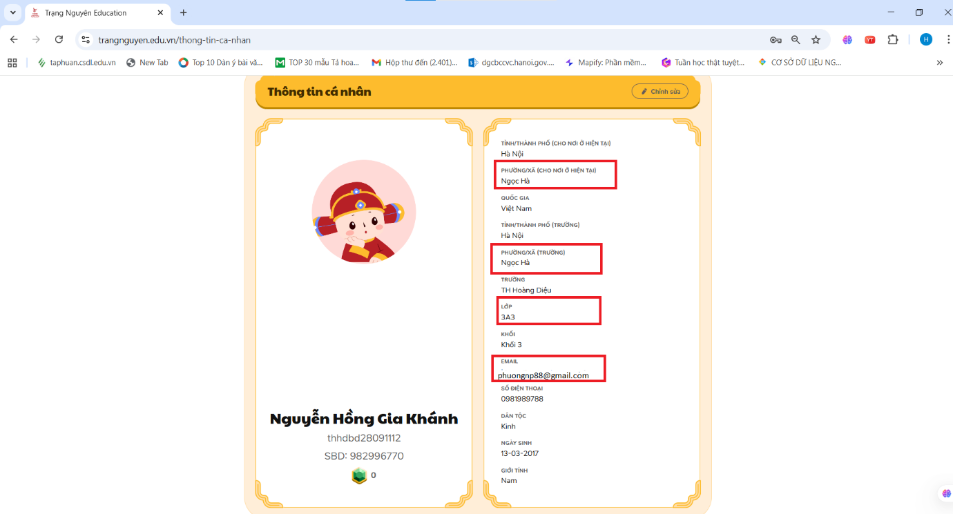 Bước 5: Chọn “Chỉnh sửa” cập nhật tên lớp, địa chỉ trường phường Ngọc Hà, địa chỉ email phụ huynh như hình dưới đây:
