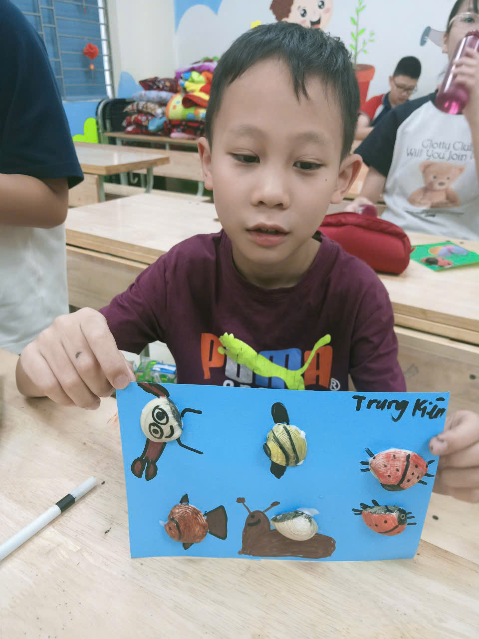 Không khí sáng tạo lên cao khi các bạn được tham gia vào hoạt động tái chế – sáng tạo xanh. Với những nguyên vật liệu đơn giản như chai nhựa, giấy bìa, lõi cuộn giấy hay muỗng nhựa…, các bạn đã biến hóa chúng thành những sản phẩm đầy màu sắc và ý tưởng độc đáo: từ những con vật ngộ nghĩnh, mô hình xe, khung ảnh, chậu cây nhỏ xinh… Từng nhóm học sinh đều làm việc say mê và hào hứng, thể hiện sự sáng tạo, tính thẩm mỹ và tinh thần trách nhiệm với môi trường.